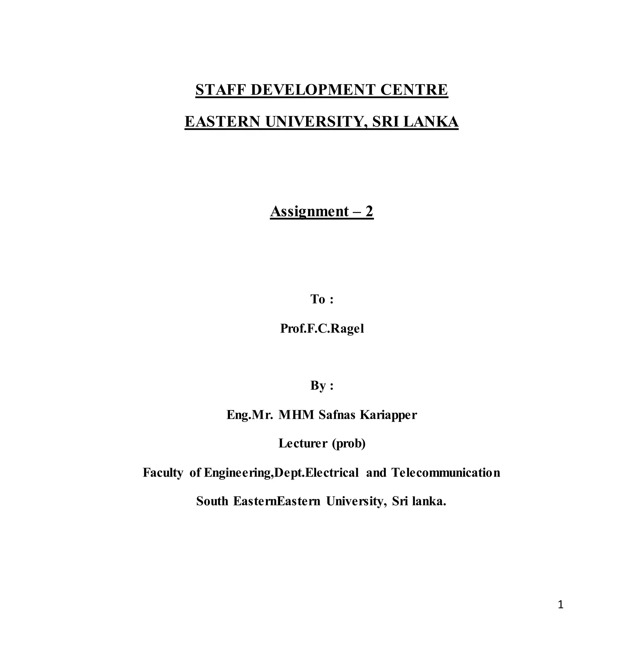 The document outlines the program outcomes for the Bachelor of Science Honours in Engineering degree program at the South Eastern University of Sri Lanka Faculty of Engineering. The faculty offers specializations in civil, electrical and electronic, and mechanical engineering. For the electrical and telecommunications engineering specialization, the expected program outcomes are listed. They include applying engineering knowledge to solve complex problems, designing systems to meet needs with health and safety considerations, investigating problems through research, and communicating effectively about engineering activities.