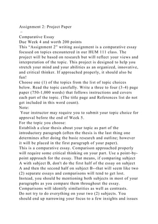Assignment 2 requires students to write a comparative essay based on topics from the HUM 111 class, emphasizing their viewpoints and critical thinking. Students must choose one topic from a provided list, develop a clear thesis, and include at least three academic sources following APA guidelines, while adhering to specific formatting requirements. The essay should explore similarities and differences between the subjects, relating insights to modern cultural ideals and the workplace.