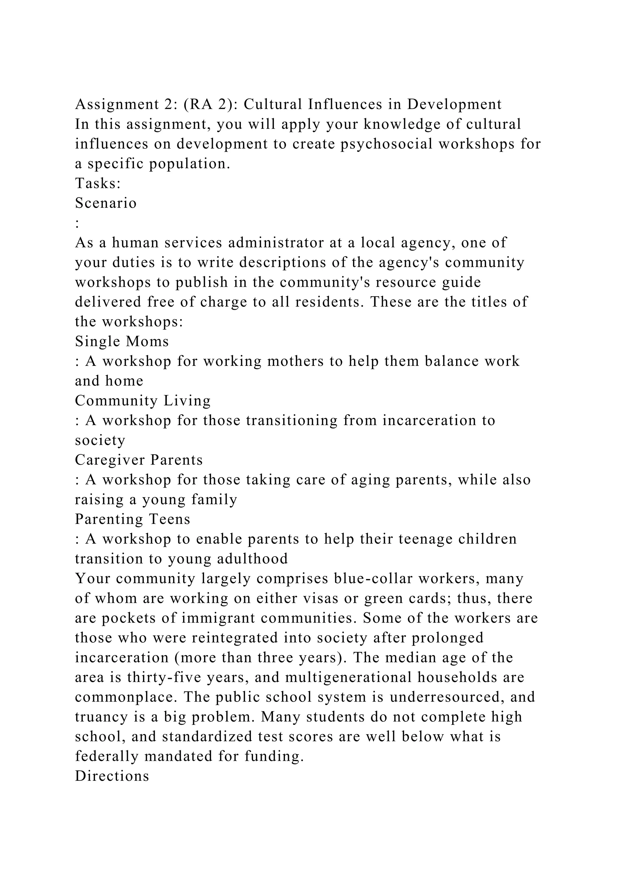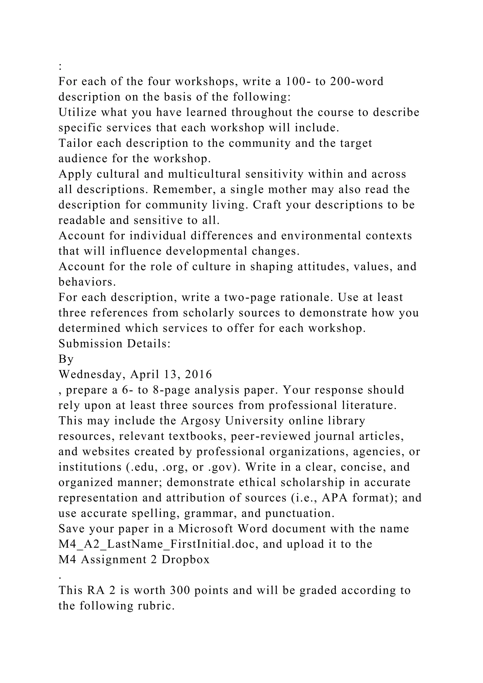 The assignment focuses on creating psychosocial workshop descriptions tailored for specific populations, including single mothers, caregivers, and individuals transitioning from incarceration. Each workshop description should reflect cultural sensitivity and address community needs, with a requirement for a two-page rationale supported by scholarly references. The final submission consists of a 6- to 8-page analysis paper due by April 13, 2016, and should follow APA format and ethical scholarship guidelines.