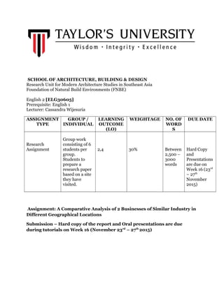 This document outlines an assignment for a group research project comparing two similar businesses in different geographical locations. Students will form groups to conduct primary and secondary research on their chosen businesses. They must visit the business locations, interview owners/managers, and incorporate at least 10 sources in their 2,500-3,000 word written report. Students will also present their findings to the class. The report will be assessed based on topic content, format, and the in-class presentation. Detailed guidelines are provided on the research methodology, report structure, and assessment criteria.