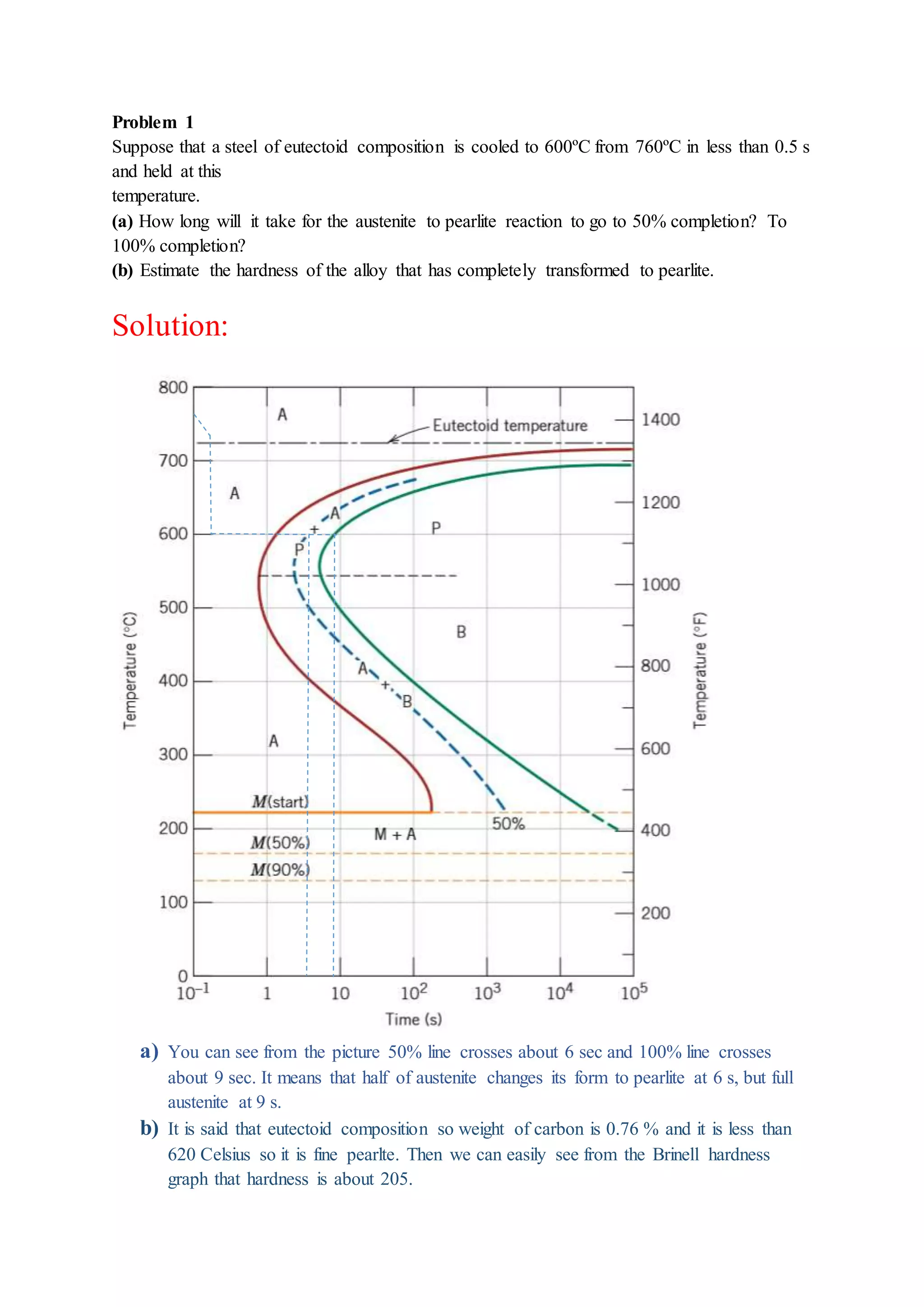 The document provides solutions to problems involving interpreting an isothermal transformation diagram for an iron-carbon alloy of eutectoid composition. In problem 1, it is determined that for 50% completion of the austenite to pearlite reaction it will take 6 seconds, and for 100% completion it will take 9 seconds. The hardness of fully transformed pearlite is estimated to be around 205 Brinell. Problem 2 specifies the microconstituents and percentages that would result from various time-temperature treatments. Problem 3 involves sketching time-temperature paths on the diagram that would produce 100% fine pearlite and a microstructure with 50% coarse pearlite, 25% bainite, and 25% martensite