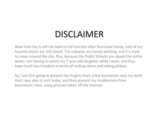 The document discusses businesses in the Upper East Side of Manhattan that were visited after Hurricane Sandy. It summarizes insights from Mélange deli, a neighborhood flower store, and a new frozen yogurt shop. It also describes an empty drug store and favorite stores like L'Occitane, Apple, and Whole Foods that couldn't be accessed. The conclusion states that for businesses to succeed, salespeople should be knowledgeable, believe in their products, care about customers, and provide honest advice without pressure to buy.