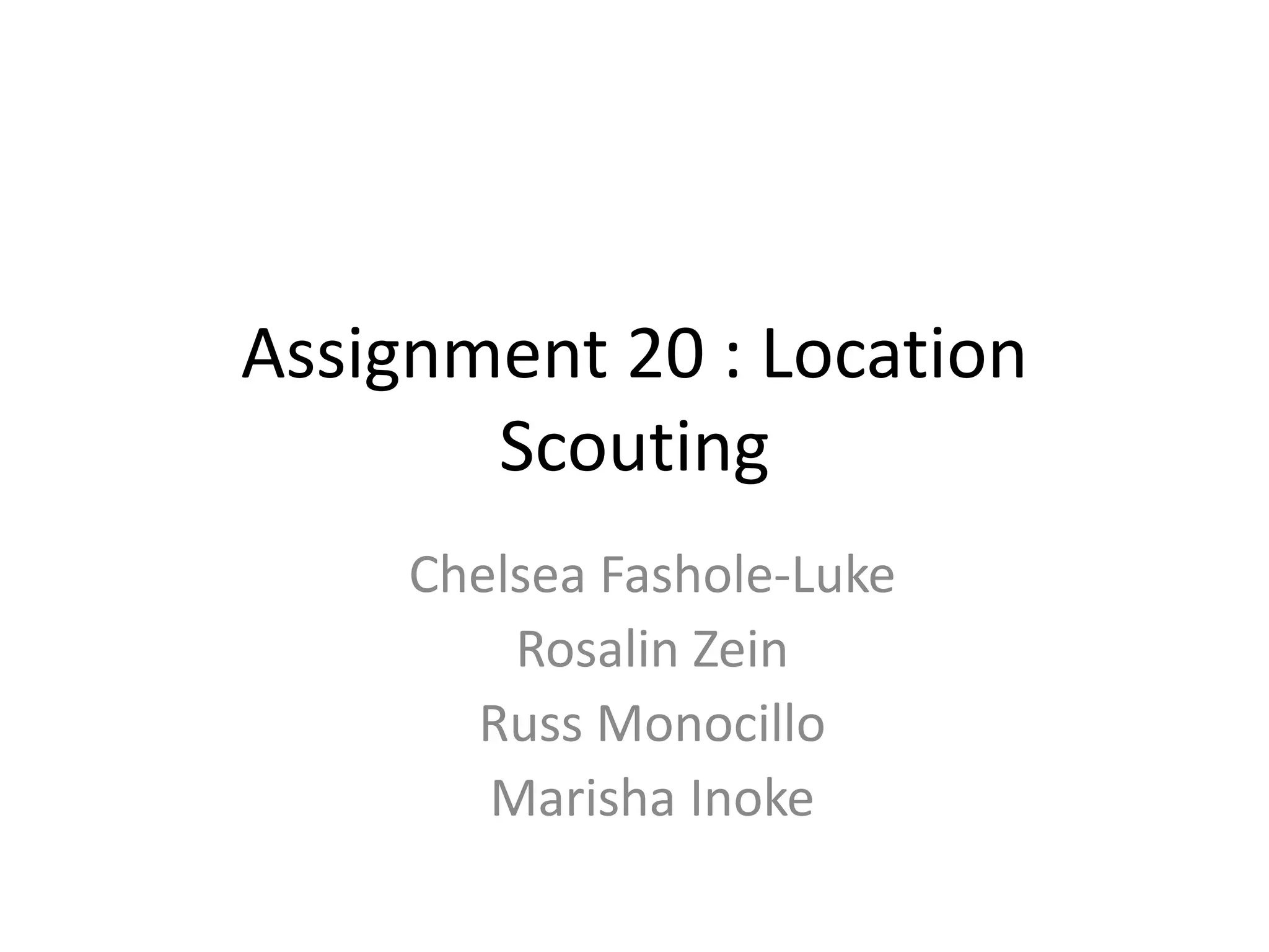 This document provides location scouting notes for a documentary film project. It maps out and evaluates four potential filming locations - Trafalgar Square, Westfield Shopping Centre, Camden Town, and Convent of Jesus and Mary school. For each location, it lists pros and cons in terms of available space, lighting, background noise levels, ability to conduct interviews, and permission requirements. The best option may be the Convent of Jesus and Mary school due to easy filming access and quiet spaces available after school hours.