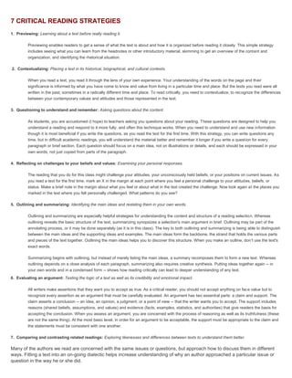 This document discusses various reading comprehension strategies. It identifies seven core strategies taught in classrooms: activating background knowledge, questioning the text, drawing inferences, determining importance, creating mental images, repairing understanding, and synthesizing information. It also discusses strategies for speed reading such as skimming and scanning. Skimming involves looking for main ideas by reading topic sentences and dropping down through paragraphs. Scanning is used to find specific information by focusing on key words. The document contrasts intensive reading, which involves close analysis, and extensive reading, which is done more quickly for pleasure or information. It provides examples of classroom reading techniques such as activating prior knowledge, setting purpose, and tasks like predicting, gathering information, and summarizing.