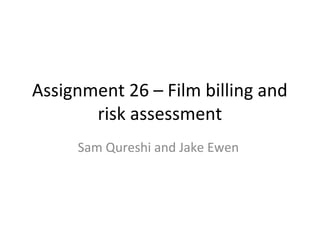 This document contains notes from Sam Qureshi and Jake Ewen on film billing and a risk assessment for a film project. It discusses potential hazards like equipment damage, transportation issues, lighting problems, difficult weather or surfaces, stunts, noise, heavy lifting, confined spaces and forgetting props/costumes. It analyzes how each hazard could impact filming and who may be affected. The risks are categorized as high, medium, or low and potential preventions are provided.
