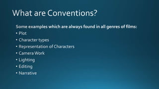 The document discusses conventions of slasher films. Some common conventions include having a young female final girl who grows in confidence throughout the film, keeping the killer/monster's identity unknown until the end to keep the audience on edge, and setting the main location in a quiet, isolated place. The document also provides examples of how films like Texas Chainsaw have used conventions like revealing the killer's face at the end, using low-key lighting in the killer's hideout, and setting the hideout in an abandoned place. It discusses developing or challenging conventions in an original student film treatment.