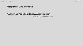 This document discusses the development of an audio enhancement application called Audihance. It begins by providing background on how the ear perceives sound and the concepts of amplitude, pressure waves, and sound perception. It then describes the intended purpose of Audihance, which is to adjust amplitude, select optimal decibel levels, and normalize transverse waves. The document outlines the naming process for Audihance and justification for combining "audio" and "enhance". A brand character diagram is sketched, and the word "happiness" is selected from the diagram for the logotype research and design.