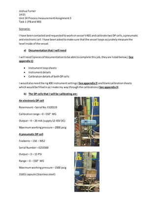 Joshua Turner was asked to calibrate two level measurement instruments (DP cells) on vessel V401. He calibrated an electronic DP cell and a pneumatic DP cell. For each calibration, he took the DP cell back to the workshop and followed a multi-step process to adjust the zero and span. His calibration records showed small errors within tolerance for both instruments. Photos provided evidence that he safely performed the calibrations according to procedures.