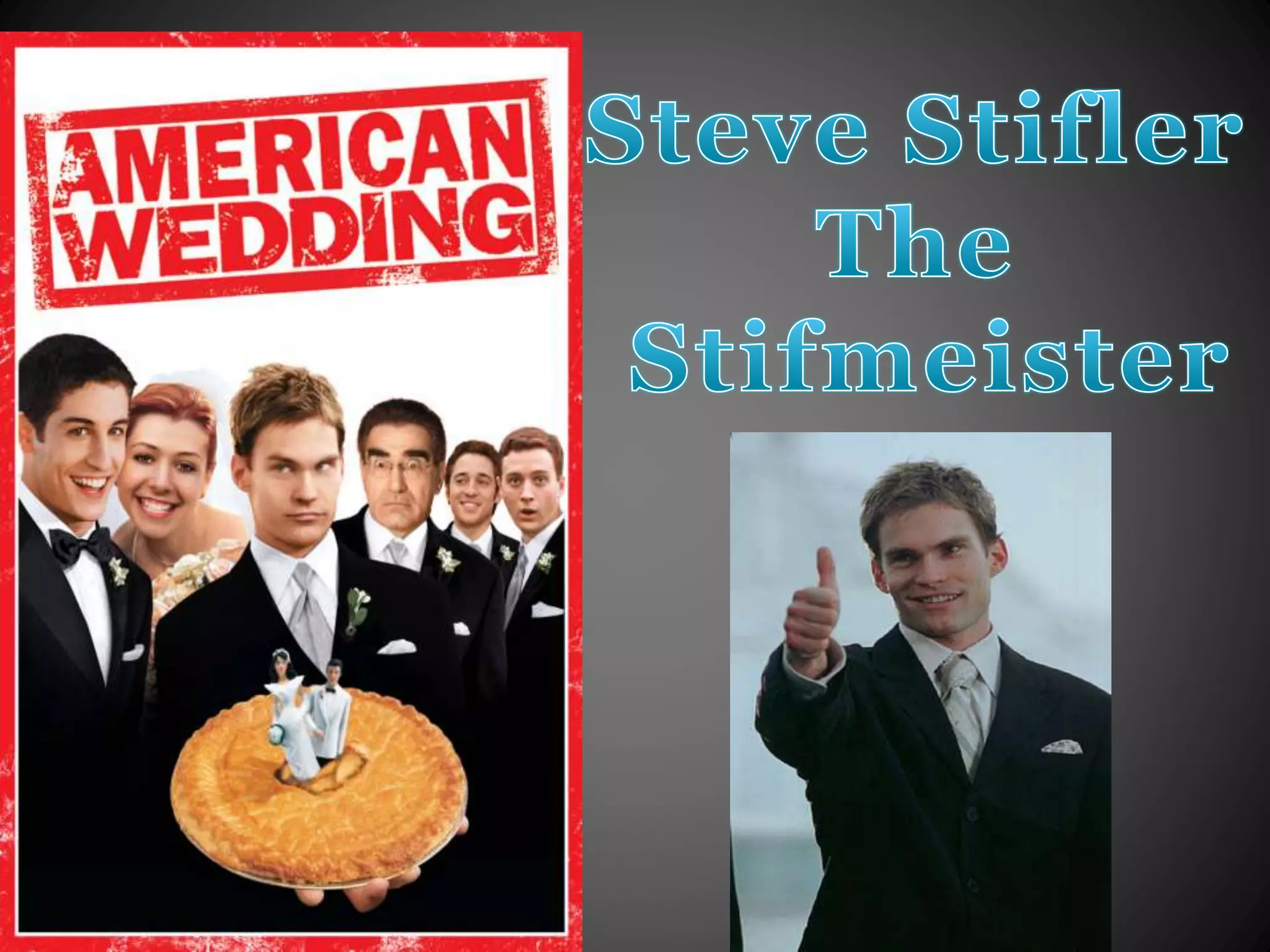 The document analyzes the character Steve Stifler from the film American Wedding. It provides both a dominant and alternative reading of Stifler. The dominant reading suggests that although Stifler is initially viewed as a self-centered asshole, over the course of the film he proves he has a soft side and cares about others, such as by helping find the bride's wedding dress and redoing the wedding flowers after ruining them. The alternative reading from a gay and lesbian perspective views Stifler as a stereotypical cisgender male focused on women and sex, but also suggests he shows hidden talents like dancing and has a journey to becoming more comfortable with his sexuality and image.