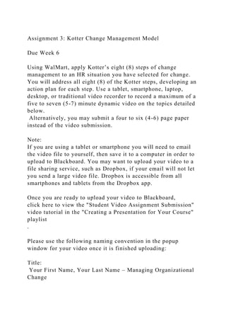 The document outlines Assignment 3, which focuses on applying Kotter's eight steps of change management in a Walmart HR situation, requiring either a video or a written paper. Students must develop a strategy addressing each step, supported by at least four academic resources and follow specific formatting guidelines. Evaluation criteria include clarity, coherence, adherence to formatting requirements, and thoroughness in addressing each change management step.