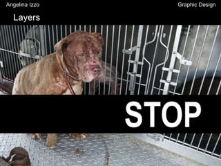 The document discusses various image editing techniques including cropping, layers, contrast and density adjustments, color balancing, image rotation, burning and dodging, saturation adjustments, adding text, vignetting, gradients, using the pen tool, opacity adjustments, spot healing, lasso tools, magic wand, clone stamp, clipping masks, and combining multiple images to create a final connotative image. The techniques are described in the context of graphic design by Angelina Izzo.