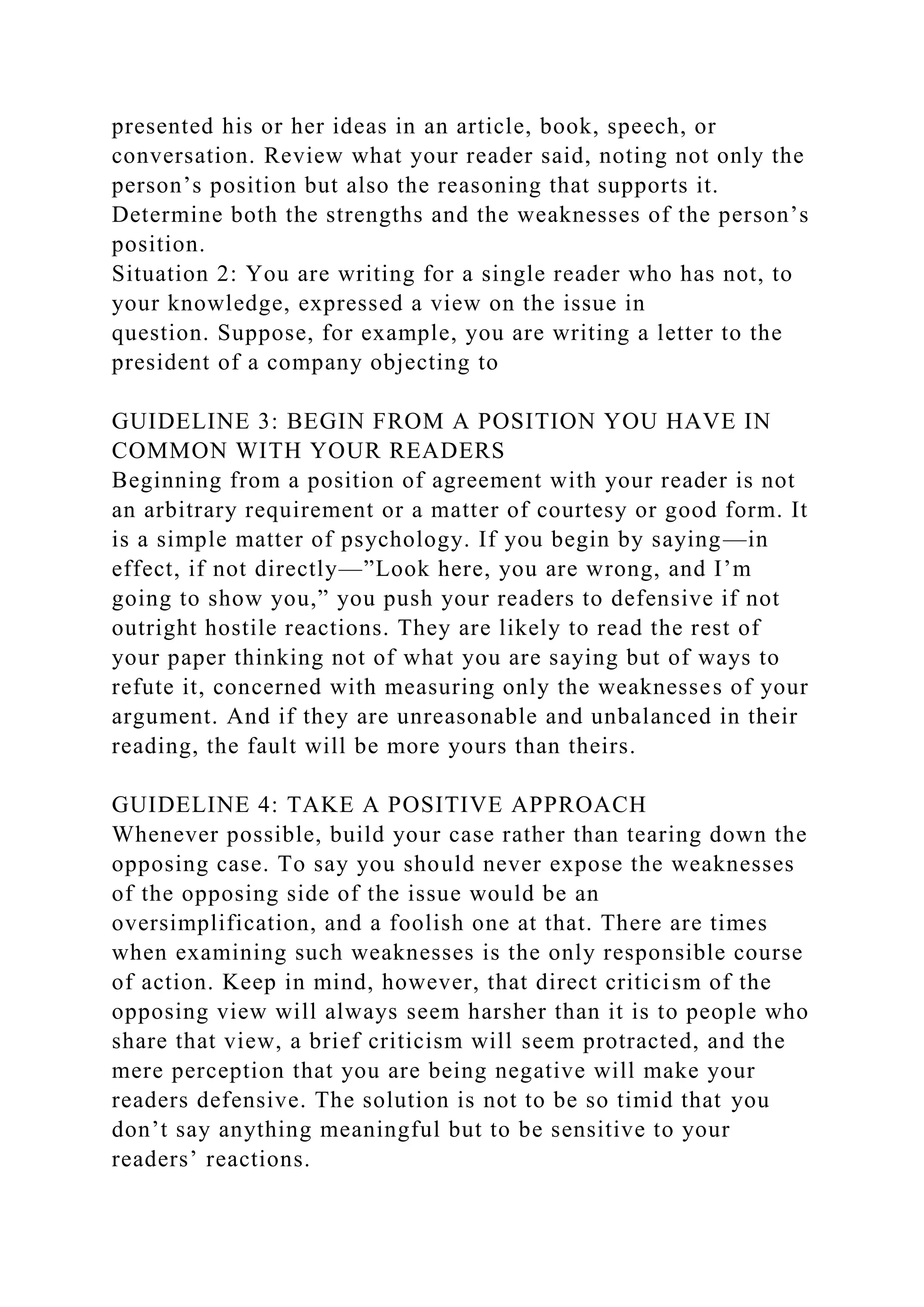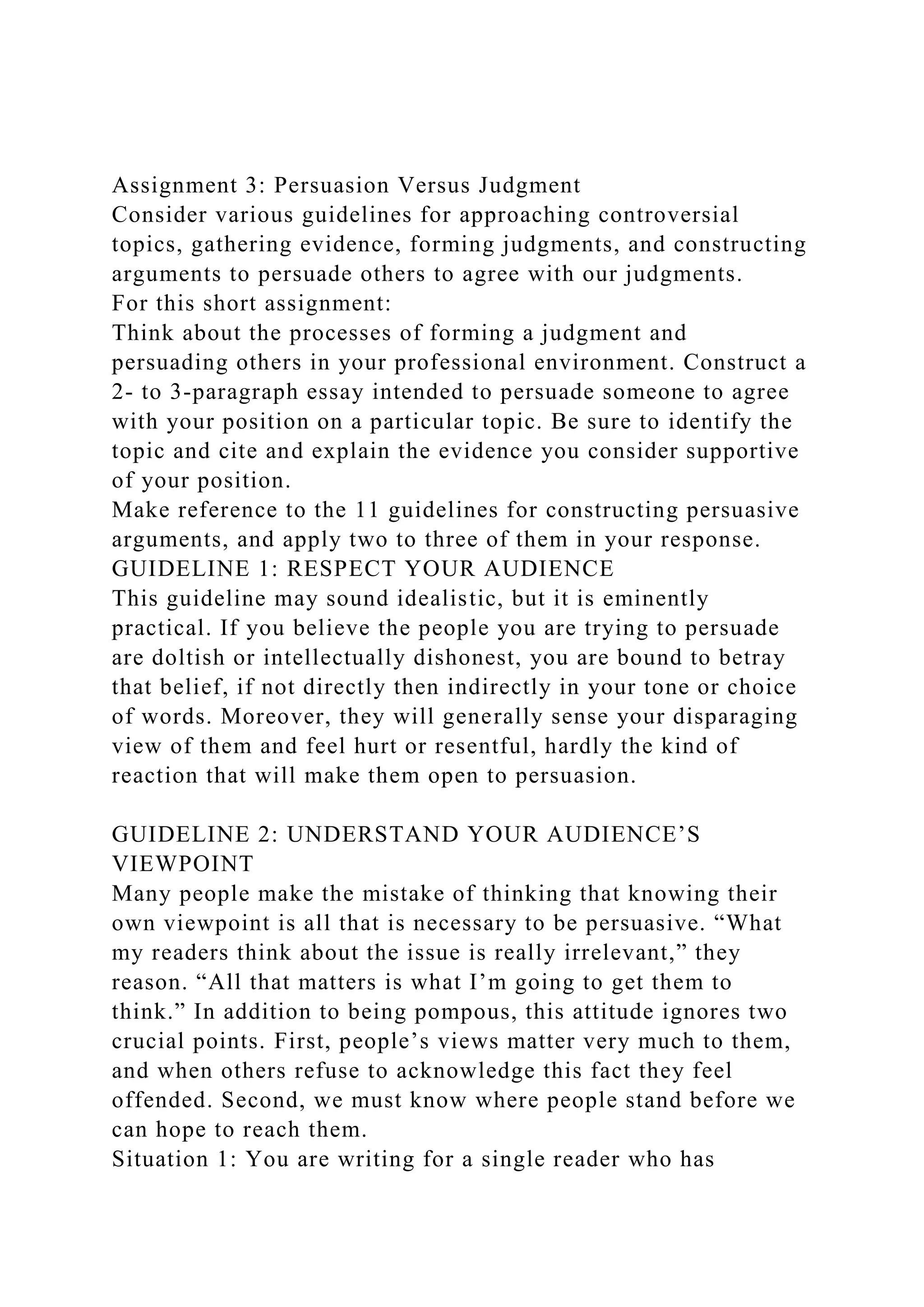 The document outlines guidelines for constructing persuasive arguments in a professional context, emphasizing the importance of understanding and respecting the audience's viewpoint while gathering evidence and forming judgments. It provides an assignment requiring a 2- to 3-paragraph essay on a controversial topic, integrating at least two of the eleven guidelines for effective persuasion. The guidelines stress approaches such as beginning from a point of commonality, taking a positive approach, and allowing time for the audience to accept one's perspective.
