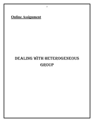 This document discusses strategies for dealing with heterogeneous student groups in the classroom. It begins by defining heterogeneous groups as those with students of varying instructional levels. Some advantages are improved reading levels through teamwork and skill-building. Key strategies discussed include cooperative learning, adapting materials to different ability levels, ensuring all students have chances to participate, and maintaining interest and discipline. The conclusion states that heterogeneous classrooms can help ensure no student is left behind, though students may not perform better academically but likely will not perform worse either.