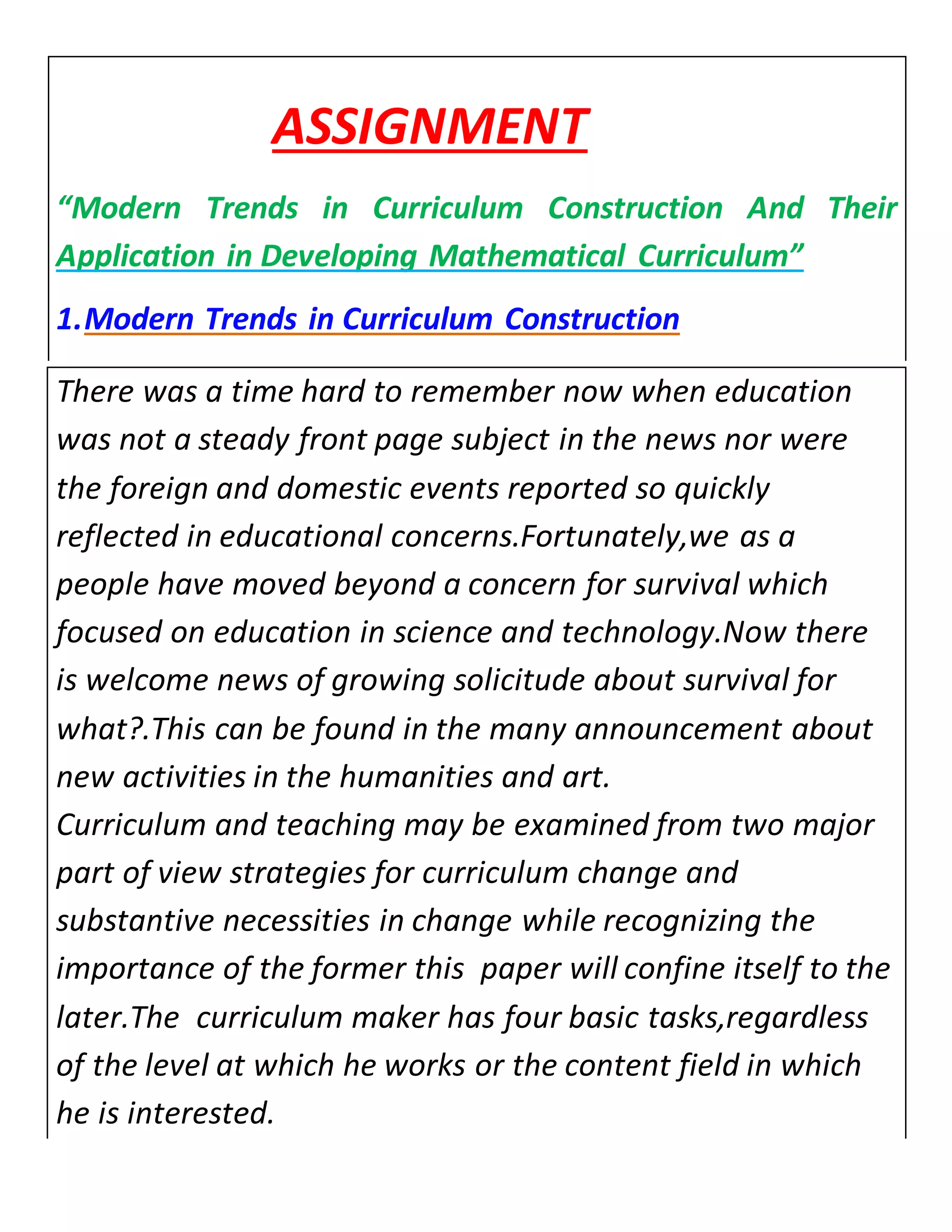 Modern trends in curriculum construction focus on respecting each individual and encouraging diversity. When developing mathematical curricula, reform groups have analyzed traditional programs and suggested improvements. They recommend introducing real numbers earlier and laying foundations for abstract algebra concepts. Curricula should integrate mathematics topics rather than separating them, and replace Euclidean geometry with algebraic treatments to reduce barriers between subjects. Many states in India have reviewed higher secondary curricula to incorporate interdisciplinary approaches due to mathematics' influence on other subjects. Some experts argue traditional Euclidean geometry is now obsolete and should be removed from high school curricula.