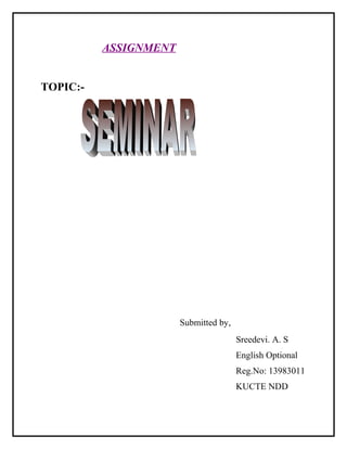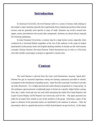 This document discusses seminars in academia. It defines a seminar as a small class focused on a specific topic that allows for significant student participation through activities like presentations, papers, and discussions. Seminars are common in American universities and required for graduation. Some European universities use large lectures called seminars. The document outlines the history, purposes, types, advantages and disadvantages of seminars.
