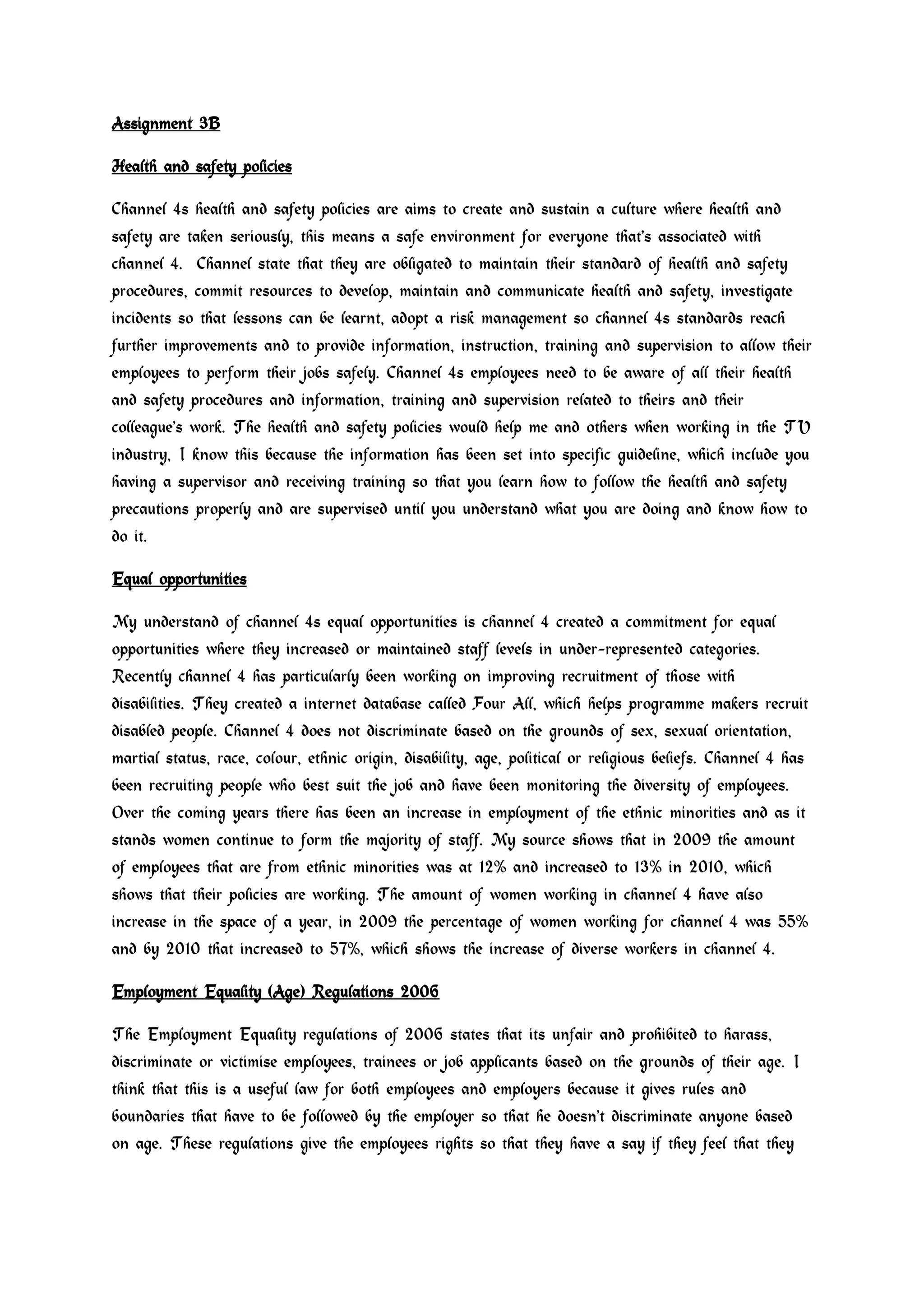 Channel 4's health and safety policies aim to create a safe environment for all employees and others. The policies require maintaining safety procedures, committing resources to safety, investigating incidents to learn from them, adopting risk management, and providing training to allow employees to work safely. Channel 4's equal opportunities policies prohibit discrimination based on attributes like gender, race, disability, and aim to increase representation of underrepresented groups. Intellectual property laws like copyright and trademarks protect creators' work and ideas from unauthorized use by others seeking profit.
