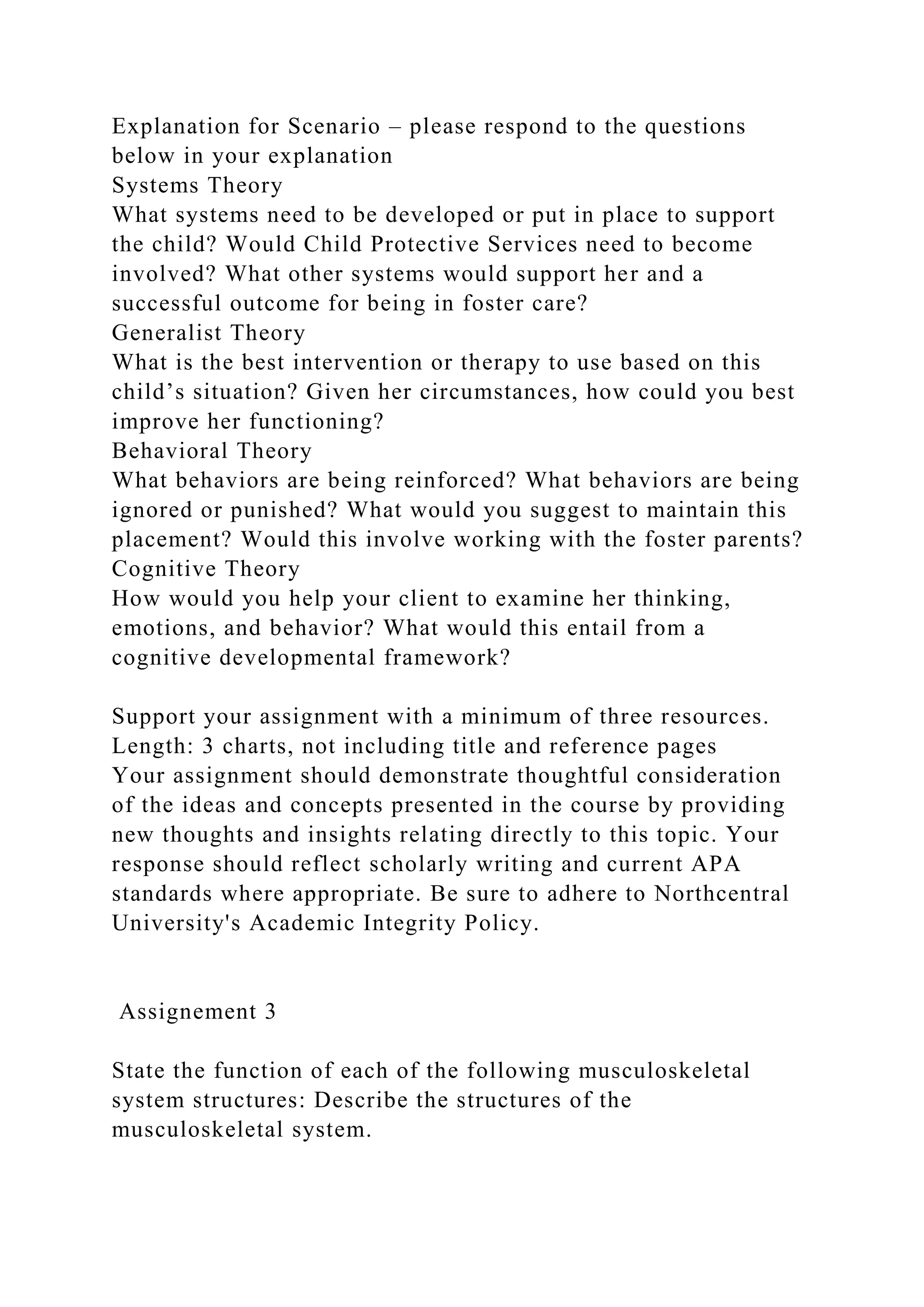 The document outlines an assignment requiring students to apply theoretical perspectives to three real-life social work scenarios involving family conflict, drug court intervention, and child welfare. Students must create charts to analyze each scenario using various theories, including systems, generalist, behavioral, and cognitive theories. Additionally, performance metrics for newspaper articles are detailed, focusing on aspects like headlines, layout, spelling, and content accuracy.