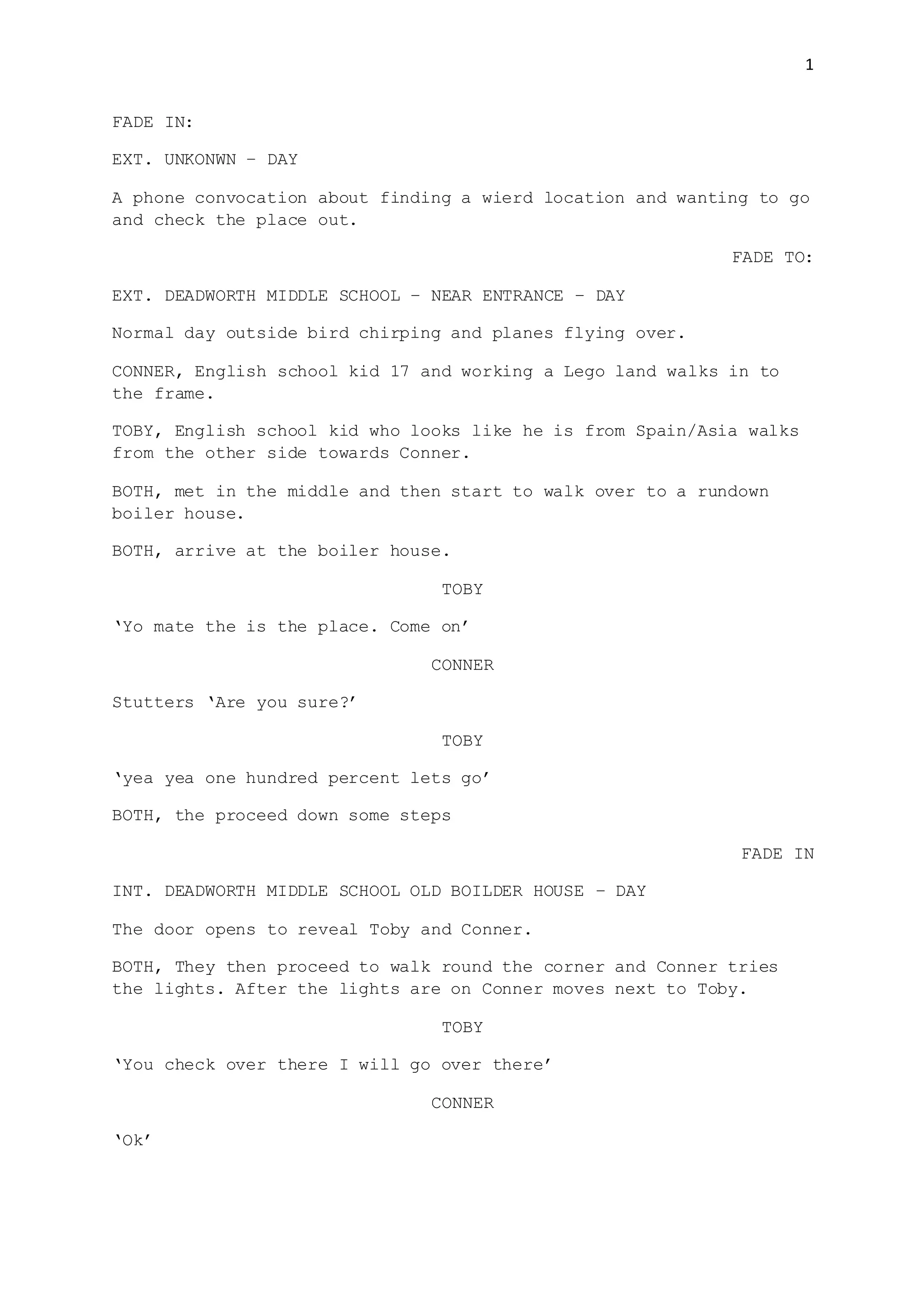Toby and Conner explore an abandoned boiler house at their old middle school. Conner finds a box containing a gun and sees a figure at the window. When the lights go out, a black figure in a gray mask appears holding the gun. It shoots Toby as Conner watches, helpless. Conner then wakes up alone and finds Toby's body gone. Toby returns saying Conner was in there for a long time, and helps him leave. At the exit, Conner sees the killer one last time before it turns off the lights.