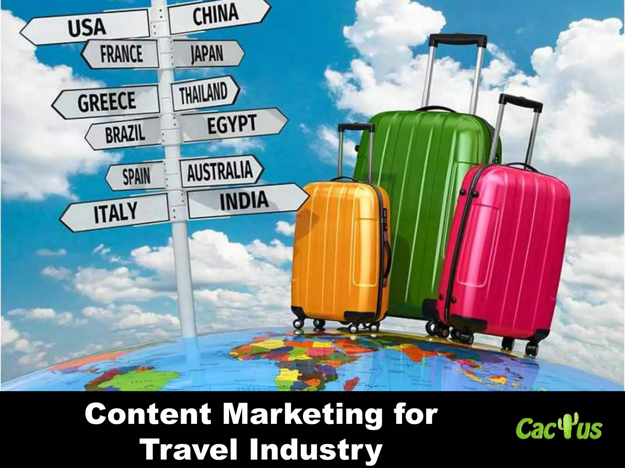 The document discusses content marketing strategies for the travel industry. It provides examples of how TripAdvisor, Airbnb, Skyscanner, and Walt Disney World use content such as reviews, tips, stories, videos and blogs on their websites and social media channels. The content helps travelers in different stages of their journey from research to booking. It also discusses how travel companies can create unique experiences and stories to engage customers emotionally.