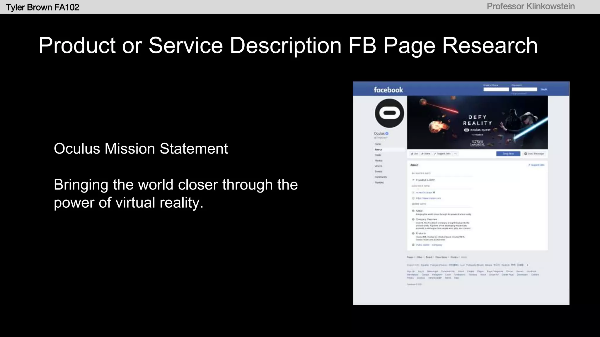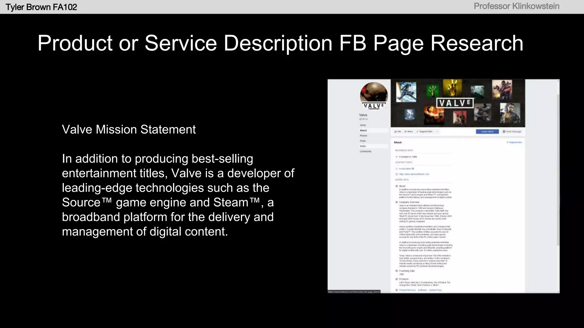 Oculus' mission is to bring people closer together through virtual reality by better assimilating students to distance learning from home. Valve aims to produce popular entertainment titles while also developing technologies like their Source game engine and Steam platform for digital content delivery and management. The document outlines the mission statements of Oculus, Valve, and discusses using virtual reality to improve distance learning beyond current in-person education options.