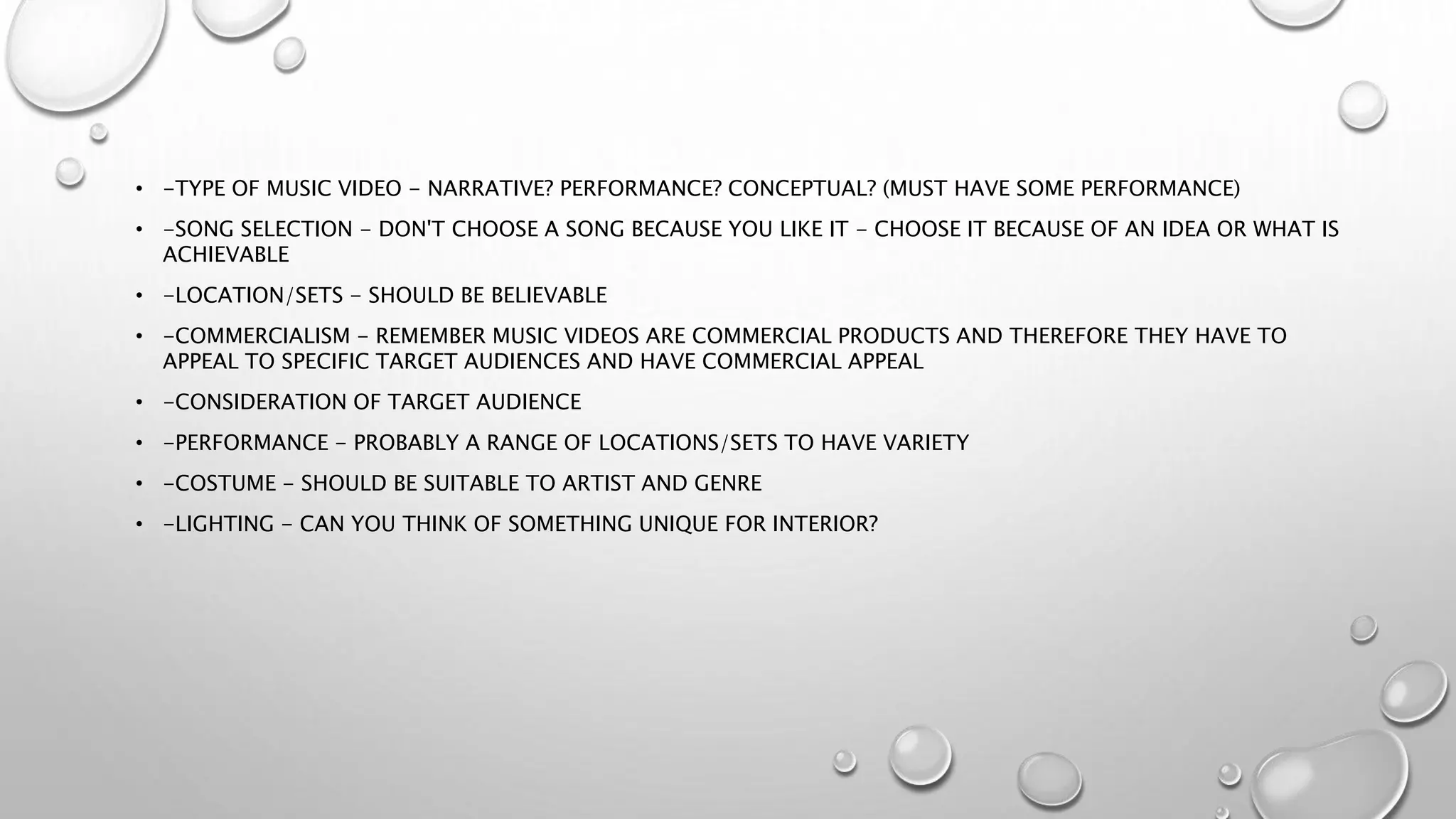 This document provides guidance for a music video assignment. It discusses key elements to consider, including the type of music video (narrative, performance, or conceptual), song selection based on ideas achievable rather than personal preference, believable locations/sets, commercial appeal to target audiences, consideration of the target audience, including a range of locations/sets for variety, suitable costumes for the artist and genre, and ideas for unique interior lighting. It then provides 3 potential music video ideas exploring these different elements for specific songs.