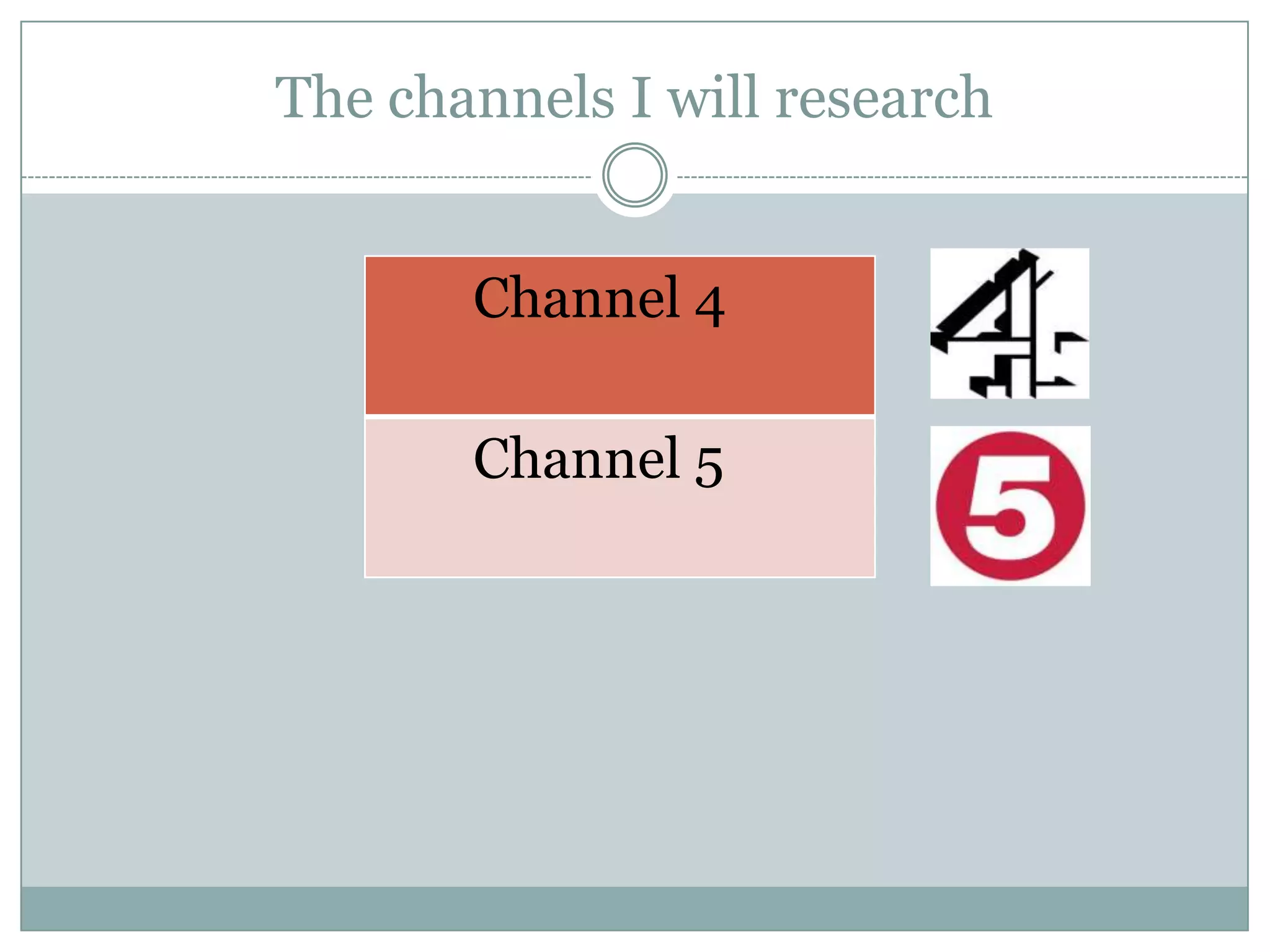 Channel 4 and Channel 5 target different audiences. Channel 4 targets males and females aged 18-35 with programs on comedy, soaps, news and politics. It commissions programs from over 300 UK production companies. Channel 4 also has a range of sister channels like E4 and Film4. Channel 5 targets a younger audience aged 2-30 with kids shows like Bananas in Pyjamas and reality TV like Celebrity Big Brother. It has fewer sister channels. Both channels show documentaries but Channel 4's cover a wider range of topics.
