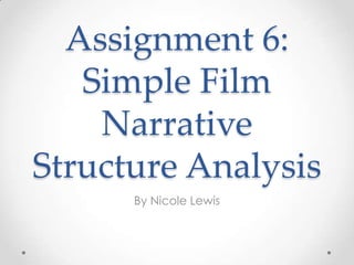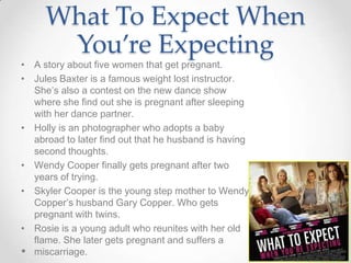 This document analyzes the narrative structure of the film "What To Expect When You're Expecting". It finds that the film follows a conventional three-act structure by introducing the characters in Act 1, creating conflicts for the characters in Act 2, and resolving everything with a happy ending in Act 3. This creates predictable and secure structure for audiences. The film also connects the characters in unexpected ways by the end.