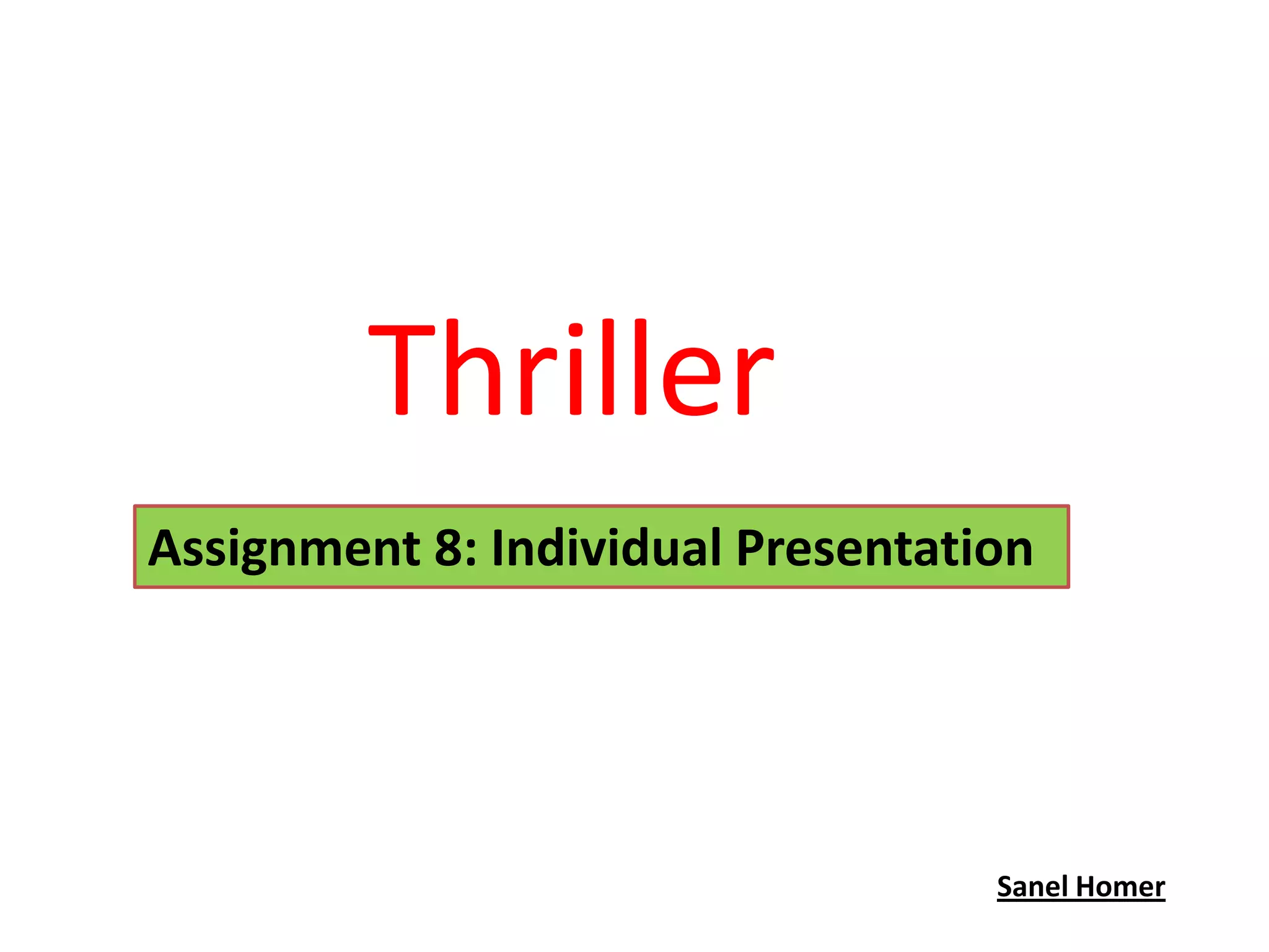 This document outlines an individual presentation on the thriller genre focusing on revenge as the theme for an opening sequence. The sequence would depict the death of a character named Jessica who is hit by a car, showing her bloody hand on the pavement and her best friend Emma grieving at her grave with a rose. The sequence and film would follow Emma seeking revenge against the bully Amy who she believes is responsible for Jessica's death.