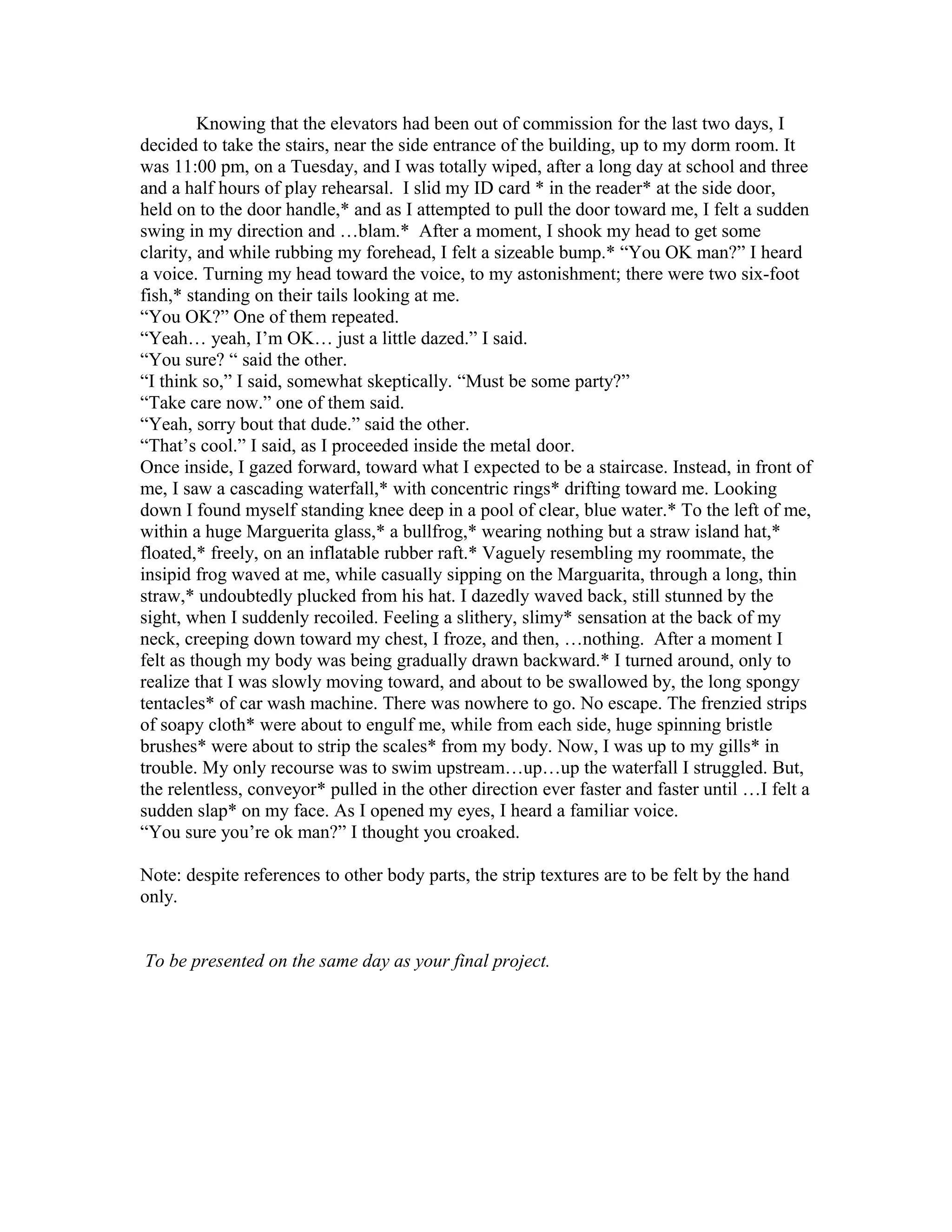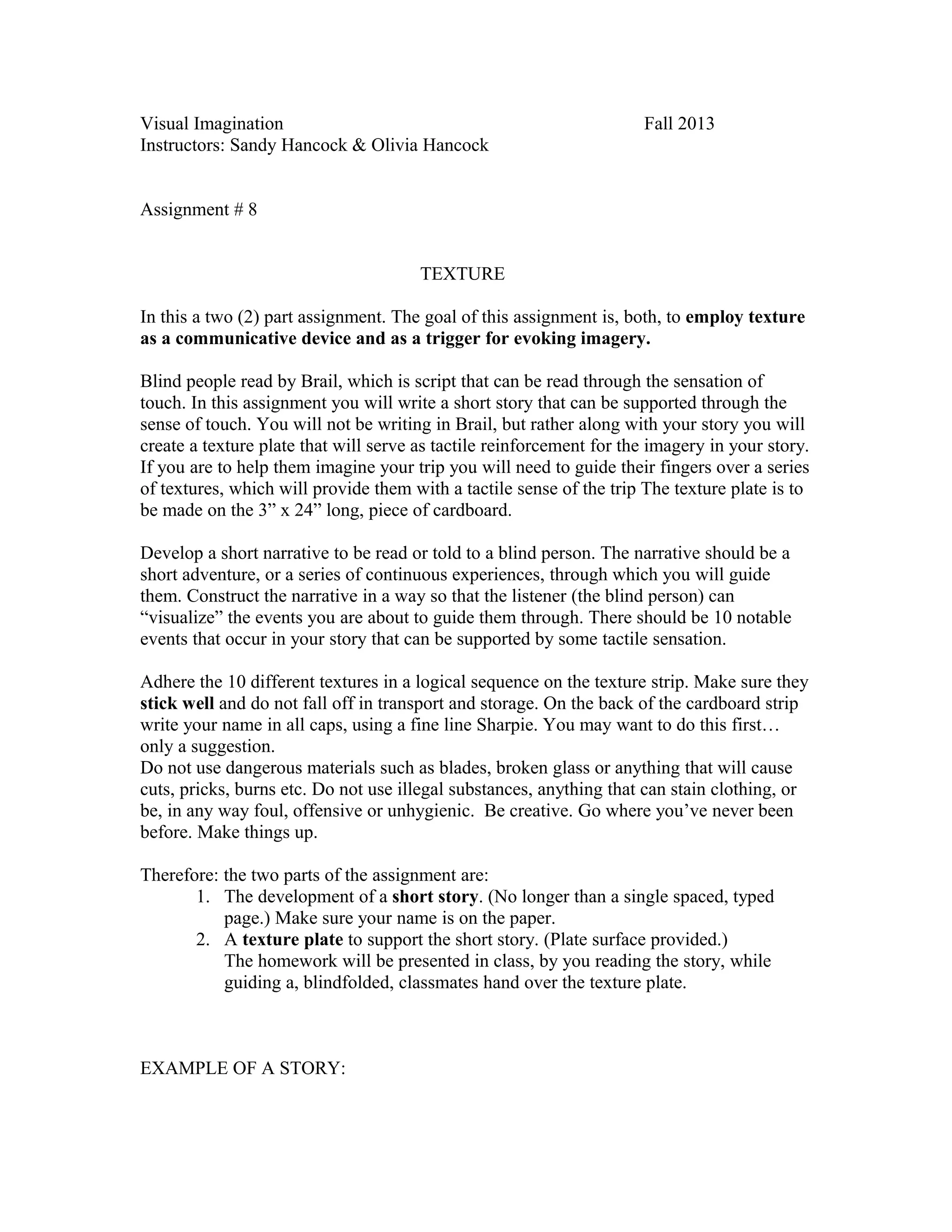 This document provides instructions for an assignment asking students to write a short story and create a corresponding texture plate to allow blind people to experience the story through touch. Students must write a narrative describing 10 notable events that can be supported by different textures adhered to cardboard. The textures should be arranged in a logical sequence to guide a blindfolded classmate's hand along the plate as they read the story aloud. An example story is provided that references textures like an ID card, door handle, bump on the forehead, fish scales, waterfall, bullfrog, drinking straw, slithery sensation, tentacles, and more.