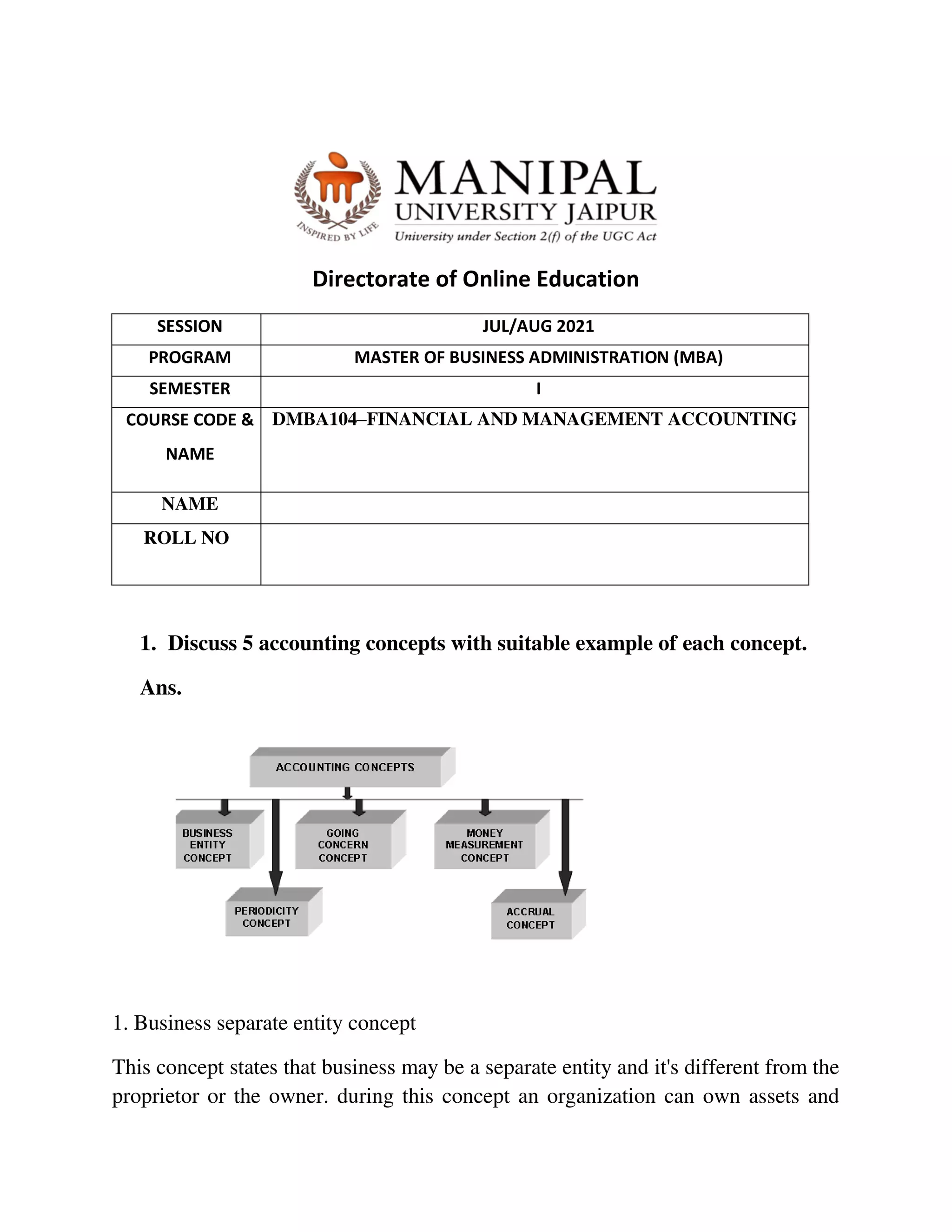 This document contains information about an MBA program session from July/August 2021, including course details and student responses to assignments. The assignments include discussing 5 accounting concepts with examples, preparing a trading account, and distinguishing between management accounting and financial accounting. It also includes the balance sheet of a company and calculations of debt-equity and proprietary ratios based on the information provided. The purpose of a cash flow statement is to analyze changes in a company's cash position and the sources and uses of cash. Examples of cash flows include receipts from customers and payments to suppliers for operating activities.