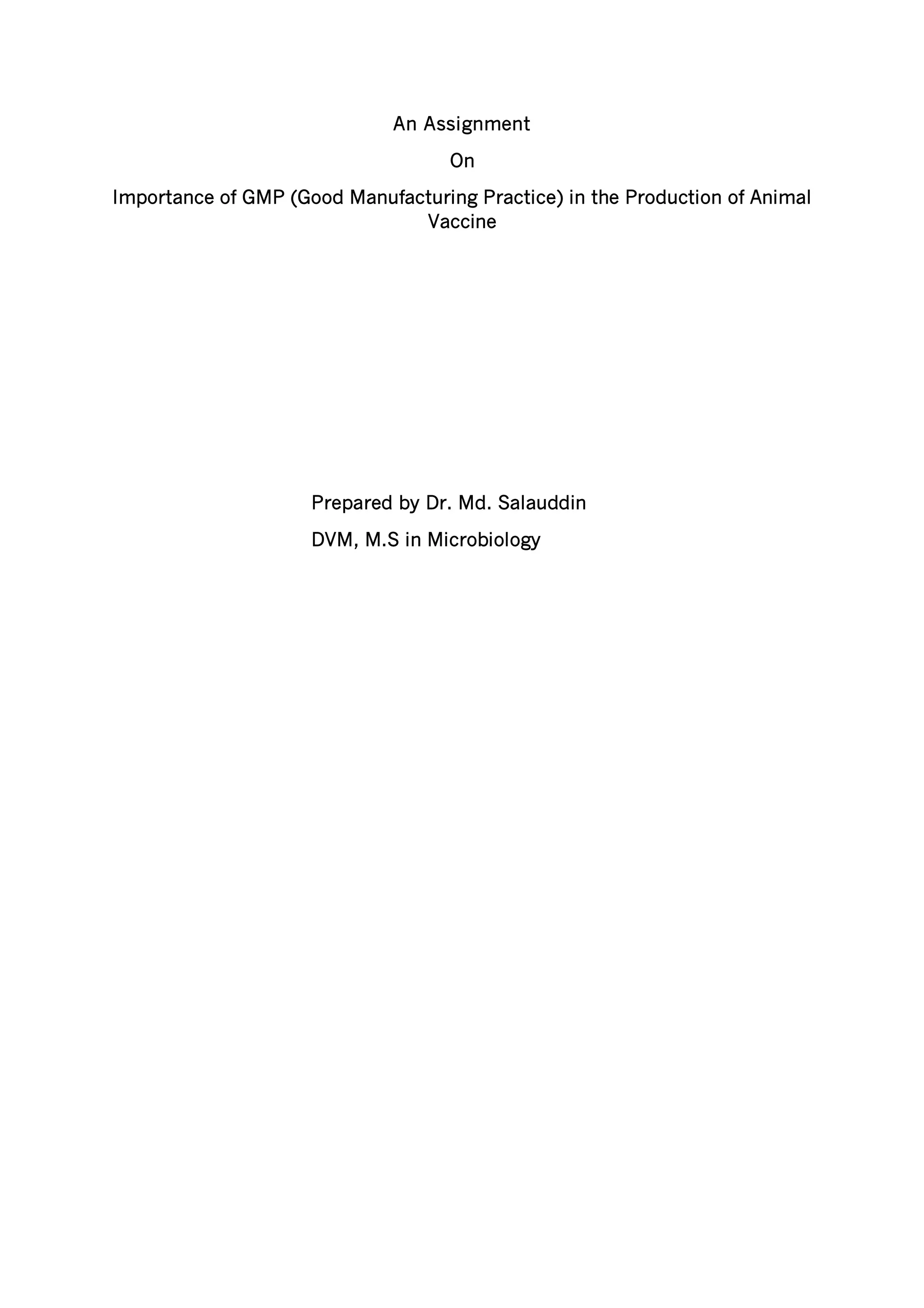 1) GMP (Good Manufacturing Practice) guidelines are important regulations that help ensure animal vaccines and other drugs/medical products are produced safely and are effective. They cover all aspects of production from materials to equipment to staff training.
