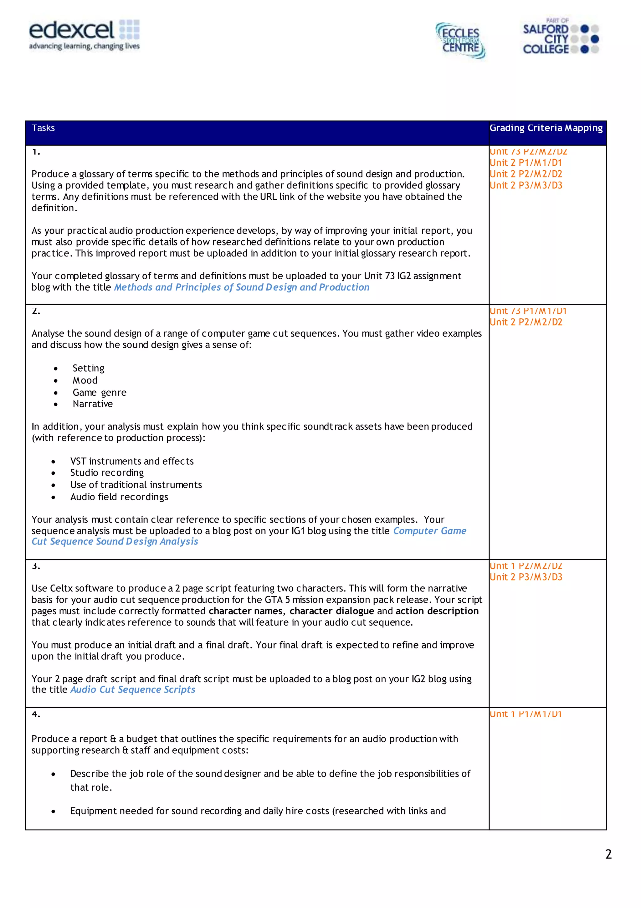 This document provides an assignment brief for a qualification in creative media production focusing on games design. The assignment involves producing audio assets for computer game cut sequences, including field recordings, voice recordings, sound effects, and compiled audio sequences. Students will research sound design, analyze existing game audio, script and record dialogue, edit recordings, create sound effects, and program sounds into a game. The assignment assesses learning outcomes related to understanding game audio, sound design principles, and pre-production documentation.