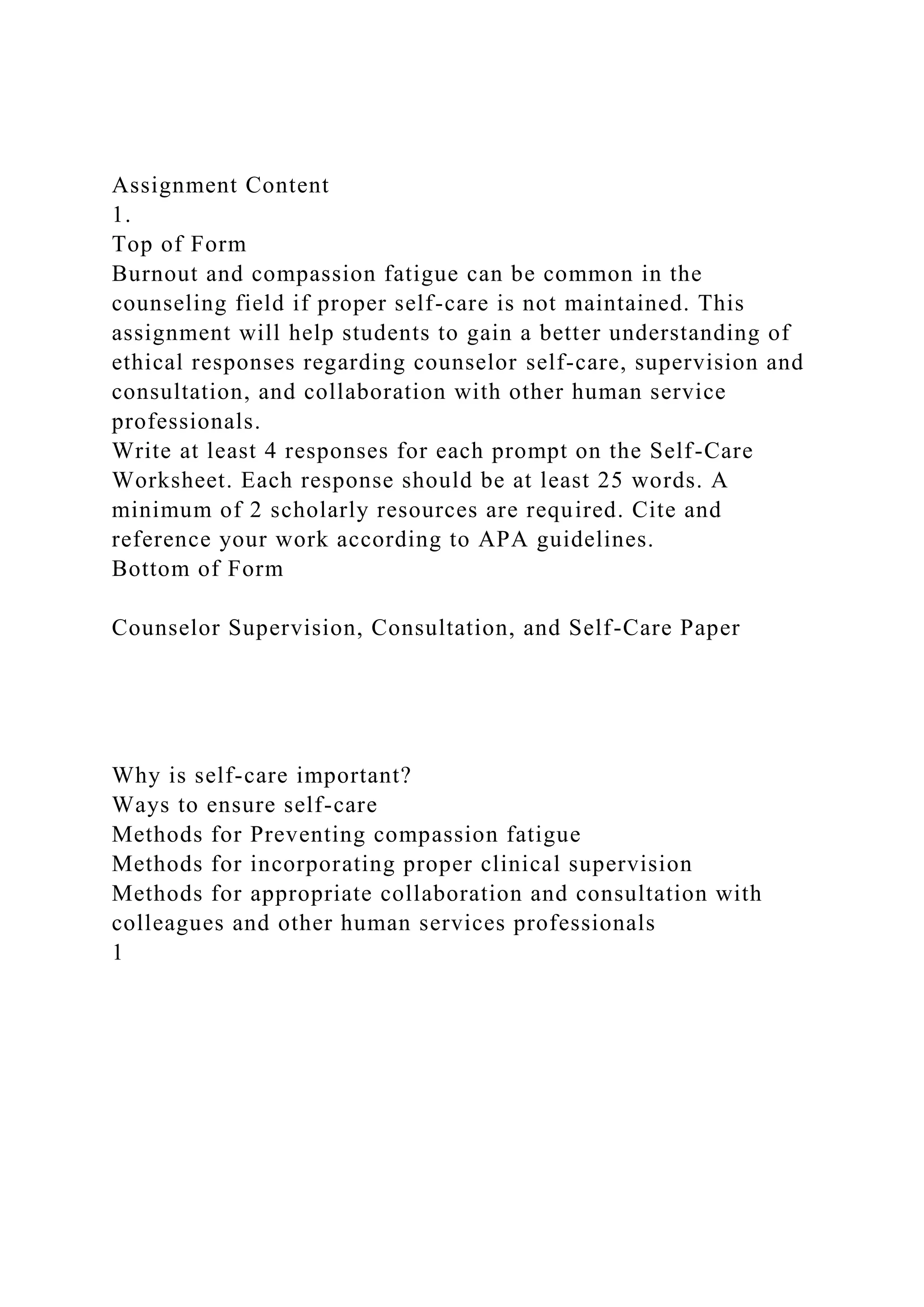 The document outlines an assignment for counseling students focused on the importance of self-care, supervision, and collaboration in preventing burnout and compassion fatigue. Students are required to provide detailed responses on self-care strategies and ethical dilemmas while engaging in discussions about social work practices through case analyses. The document emphasizes the need for a systems perspective and the role of various social influences on individual care plans.