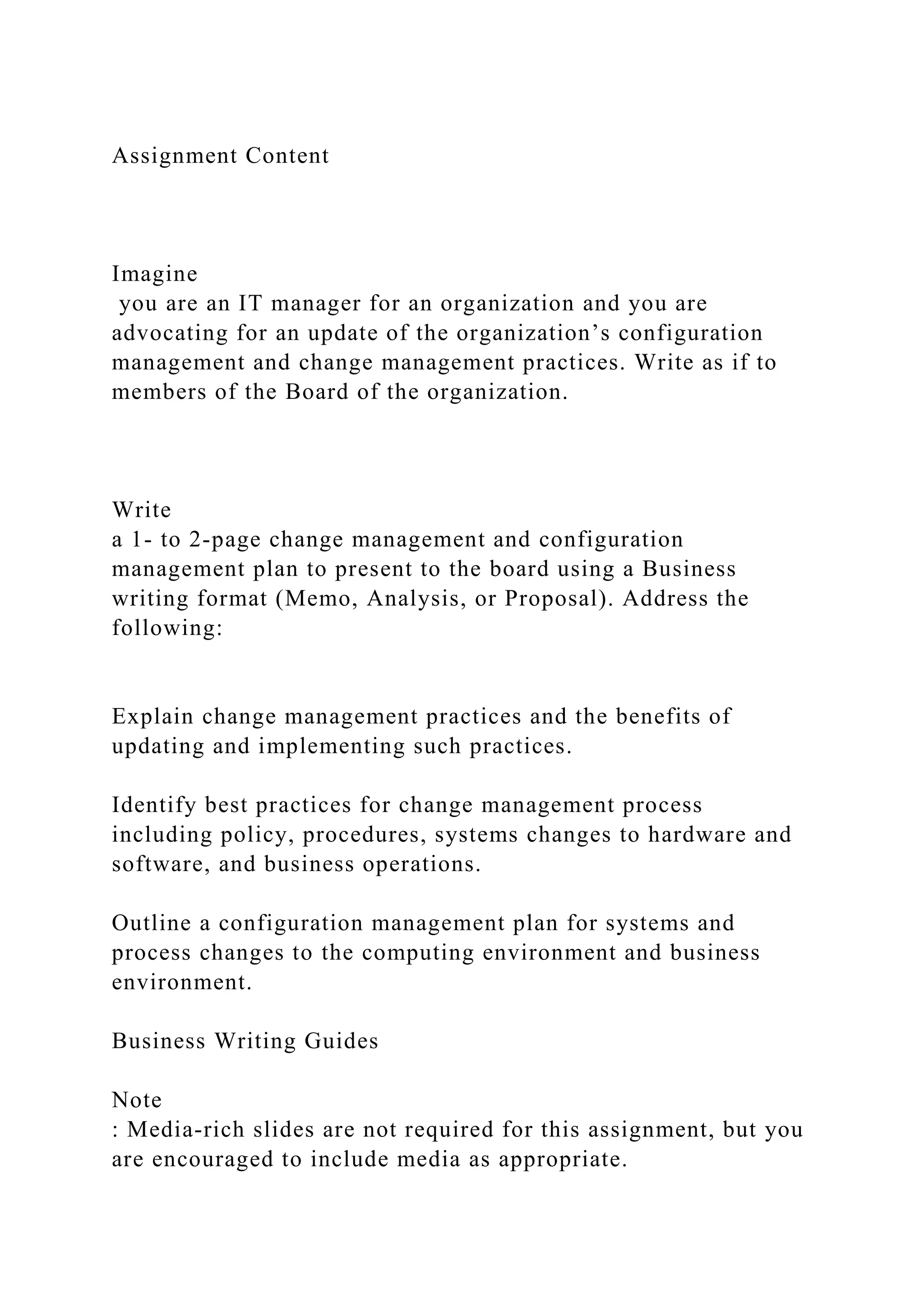 The document outlines an assignment for an IT manager to create a change management and configuration management plan aimed at the organization's board. It emphasizes the importance of updating change management practices and identifies key best practices, including policy development and procedures for hardware and software changes. Additionally, it requires outlining a configuration management plan addressing system and process changes within the organization, with a recommendation to include references in APA format.