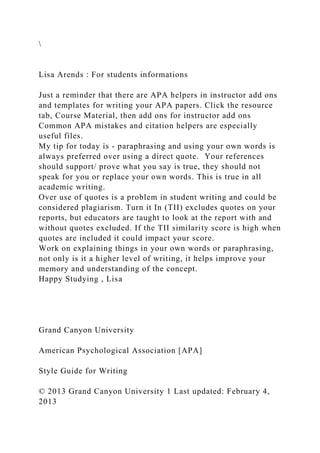 The document outlines an assignment requiring students to write a 750-1,000 word formal paper discussing the differences in nursing competencies between associate-degree and baccalaureate-degree nurses, with a specific patient care situation example. It provides detailed instructions on APA formatting, citation rules, and submission guidelines, including resources from the Grand Canyon University library and academic writing tips. Students are reminded to avoid excessive quoting and to use paraphrasing to demonstrate understanding and avoid plagiarism.
