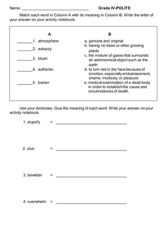 This document contains a matching activity where students must match words in Column A with their meanings in Column B. It also contains a section where students must use a dictionary to define words related to being stunned or overwhelmed. The goal is for students to practice vocabulary words related to atmosphere, autopsy, blush, authentic, and barren as well as words around being stunned or overwhelmed.