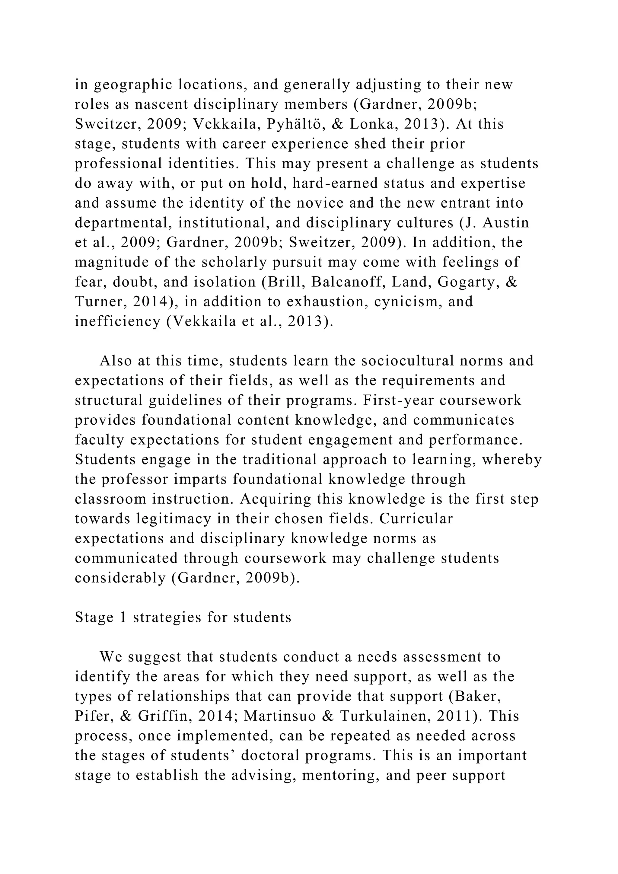 The document discusses the stages of doctoral education as outlined by Pifer and Baker (2016), emphasizing the challenges and strategies faced by students in the first two stages: knowledge consumption and knowledge creation. It suggests strategies for overcoming identity shifts, feelings of isolation, and the transition to independence as students develop their scholarly identities. The assignment prompts students to reflect on anticipated challenges in their doctoral journey and the strategies they plan to implement, using insights from the reading.