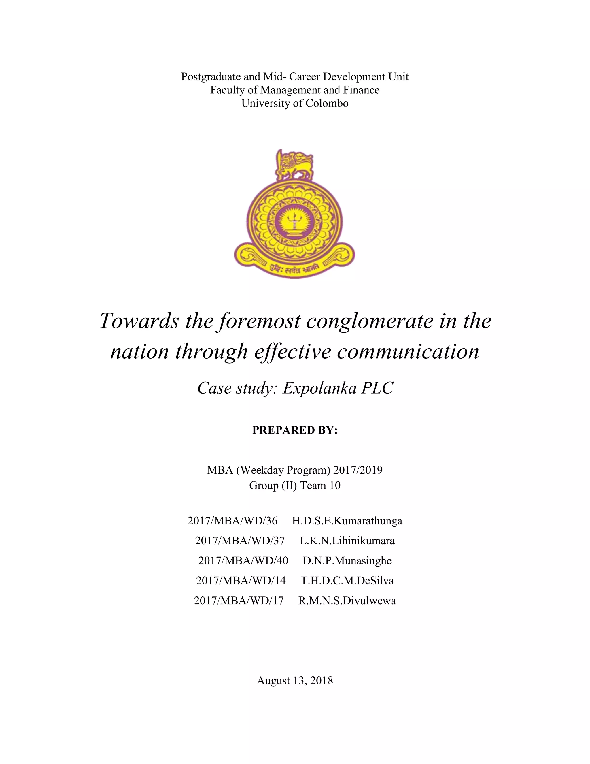 The document discusses communication issues within Expolanka PLC, a Sri Lankan conglomerate. It identifies that when Expolanka was acquired by a Japanese company in 2014, employees were not properly informed, creating uncertainty. It also finds that annual targets are not clearly communicated down the organization, so subsidiaries are unaware of expectations. Individual employee targets also lack communication. As a result, employees feel demotivated and distrust management. The document analyzes these issues in relation to communication theories like Herzberg's two-factor theory, transmission model of communication, and the 7 C's of communication, arguing effective communication is important for employee motivation, direction, and building trust within the organization.