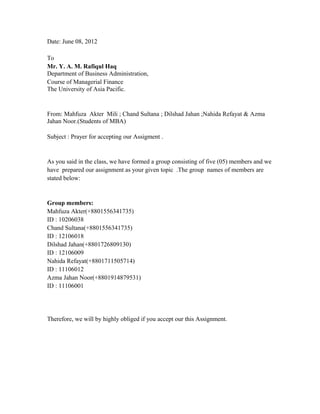 The document provides a comparative analysis of the financial statements of Saiham Textile Mills Ltd. and Ashraf Textile Mills Ltd. for the years 2008-2009. The analysis finds that Saiham Textile had higher total assets and shareholder's equity compared to Ashraf Textile in both years. While Saiham Textile's profit decreased from 2008 to 2009, Ashraf Textile's profit increased over the same period. The document also calculates various financial ratios such as liquidity, debt, asset turnover, accounts receivable turnover and inventory turnover, and profitability ratios to further analyze and compare the financial performance and position of the two textile companies.