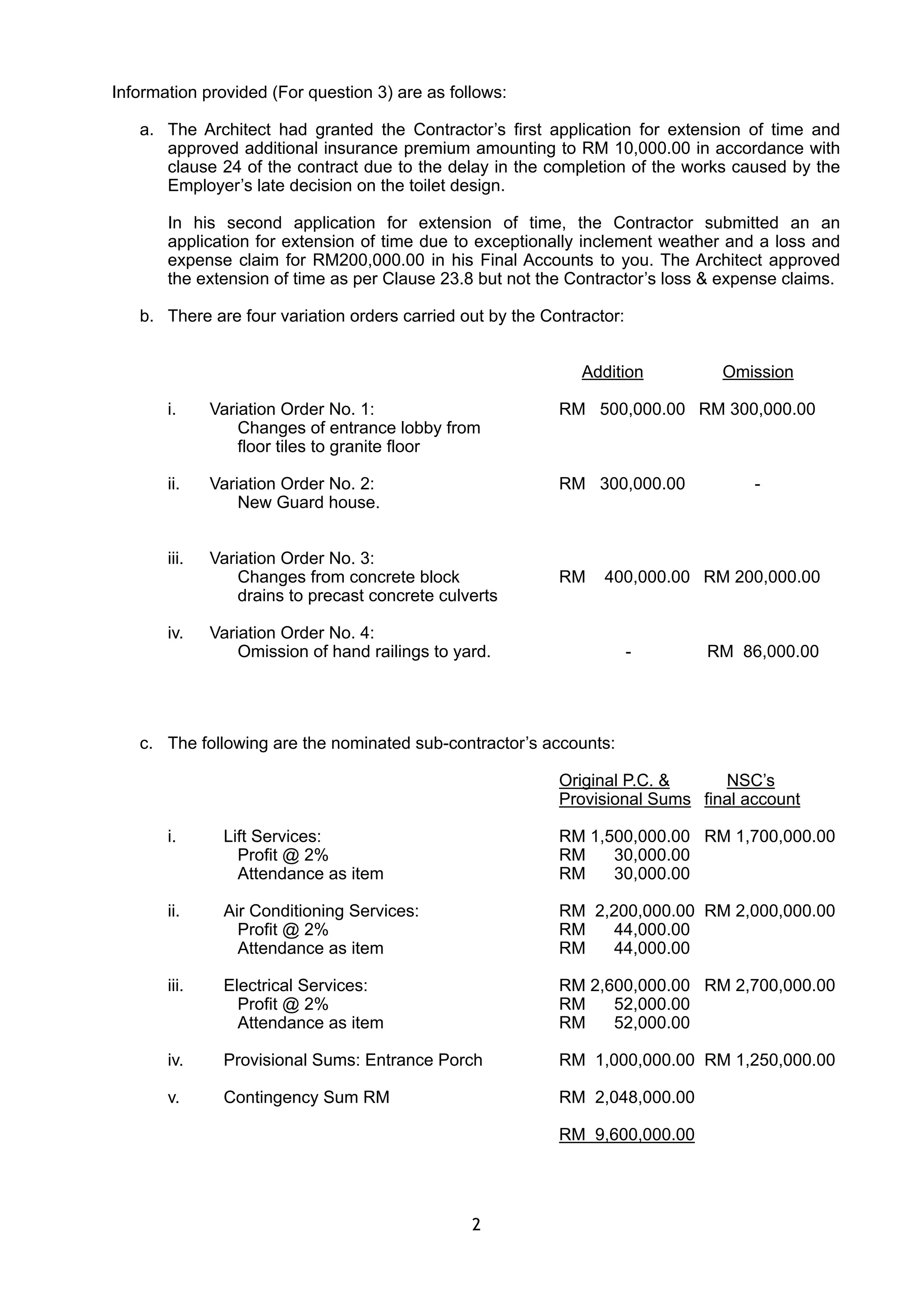 This document contains information for a coursework assignment on preparing a final account for an apartment construction project. It provides background on the contract sum and nominated subcontractors' accounts. It also lists 4 questions for the assignment: