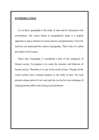 The document discusses the values of teaching geography. It outlines several intellectual, practical, and cultural benefits. Geography widens one's mental horizons, develops skills like map reading, and fosters understanding of global issues. It has vocational applications and informs fields like urban planning. Geography also shapes cultures by illustrating human adaptations to different environments. The conclusion reiterates that geography studies spatial relationships between humans and the environment, making it fundamental to understanding the world.