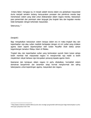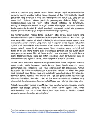 Isu mempersendakan institusi beraja di Malaysia timbul semasa pertabalan Yang di-Pertuan Agong pada tahun 2012, menimbulkan cadangan suruhanjaya diraja untuk menyiasat dan mendidik generasi muda tentang penghormatan terhadap raja-raja Melayu. Walaupun kuasa raja terbatas dalam sistem pemerintahan demokrasi, mereka tetap dilihat sebagai simbol agama Islam dan sejarah negara. Untuk mengekalkan kedudukan sistem beraja, raja harus menunjukkan keperibadian yang baik dan berpegang kepada ciri-ciri kepimpinan berasaskan syariah Islam.