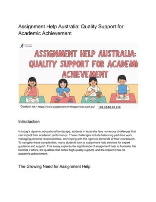 The document discusses the growing reliance on assignment help services by Australian students facing academic pressures, time constraints, and diverse challenges, including language barriers. These services offer expert guidance, high-quality work, and personalized support, significantly contributing to improved grades, enhanced understanding, and skill development. While highlighting the positive impacts, the text emphasizes the importance of using these services ethically to maintain academic integrity.