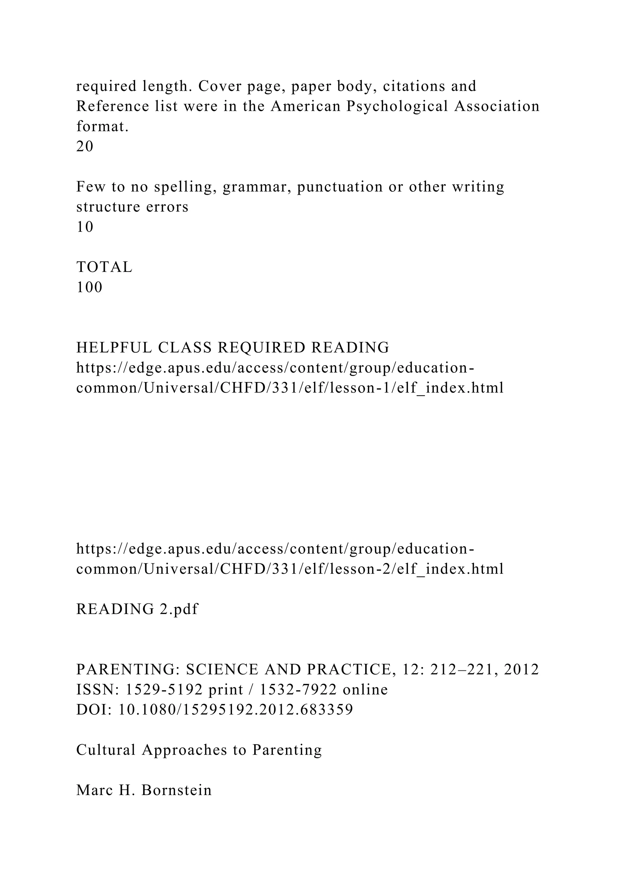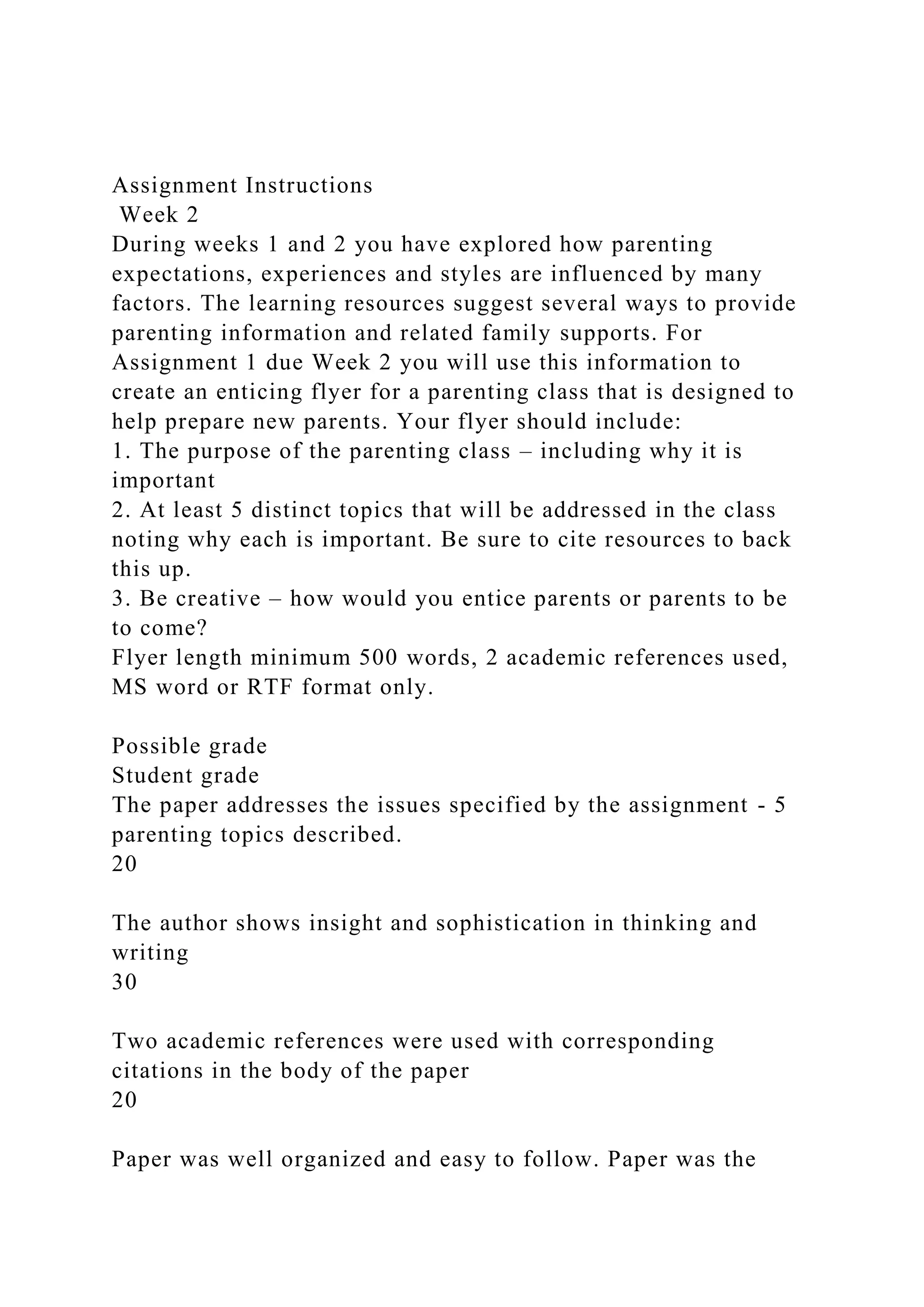 The document outlines an assignment for a parenting class flyer due in week 2, emphasizing the importance of addressing parenting expectations and styles influenced by various factors. It details requirements, including the class purpose, five distinct topics with supporting resources, and a creative approach to attract new parents, ensuring academic standards are met. Additionally, the document discusses cultural variations in parenting, highlighting how beliefs and behaviors differ across cultural contexts and their implications on parenting practices.