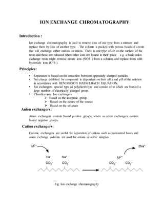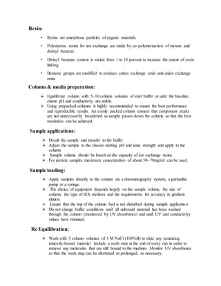 Ion exchange chromatography separates ions based on their charge. The column contains resin beads that exchange one type of ion for another. Cation exchange resins contain negatively charged groups that bind positively charged cations, while anion exchange resins contain positively charged groups that bind negatively charged anions. Samples are loaded onto the column and different ions elute at different rates depending on their interaction with the charged resin. Ion exchange chromatography is useful for desalting samples and separating mixtures of biological or inorganic ions.