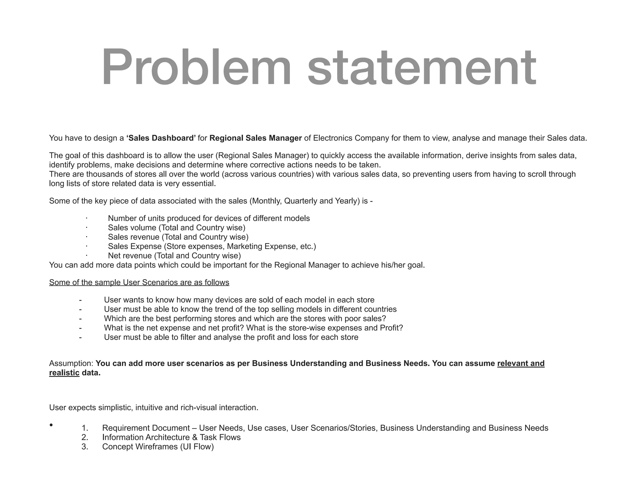 Karl Joe is a regional sales manager who is tasked with meeting sales targets. He finds the sales data he currently has access to is difficult to analyze and gain insights from due to the large amount of raw and unrelated data presented in tables. This makes it challenging for him to identify problems and take corrective actions. The proposed sales dashboard solution aims to provide Karl Joe with a customizable and visually-rich interface that presents key metrics and filters in an intuitive way. It also leverages voice search and questions to help Karl analyze trends and drill down into store or product-level details more easily. The goal is to empower Karl to make data-driven decisions and monitor performance against goals in a quick and simplified manner.