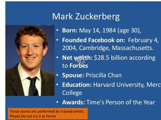 Facebook has become the world's most popular social networking site with over 550 million active users, 50 million more than the population of China. It has strengths like keeping personal and public content separate, suggested friends, groups, comments, and messages. However, it also faces risks, as it relies on advertisements for over 80% of revenue but revenue growth depends on user growth, and it struggles to monetize mobile users. Facebook also faces privacy issues as users are frustrated by frequent changes to privacy settings. Privacy restrictions could limit Facebook's ability to offer personal marketing opportunities to companies.