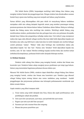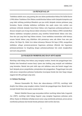 Dokumen ini membahas tentang tatabahasa dalam Bahasa Melayu, termasuk definisi morfologi dan sintaksis, serta proses pembentukan kata. Tatabahasa terdiri dari pengaturan yang membentuk kata dan ayat, serta melibatkan konsep morfem, jenis kata, dan pembentukannya. Selain itu, dokumen ini juga menjelaskan prinsip-prinsip pengajaran tatabahasa yang efektif untuk menyebarkan ilmu pengetahuan kepada murid.