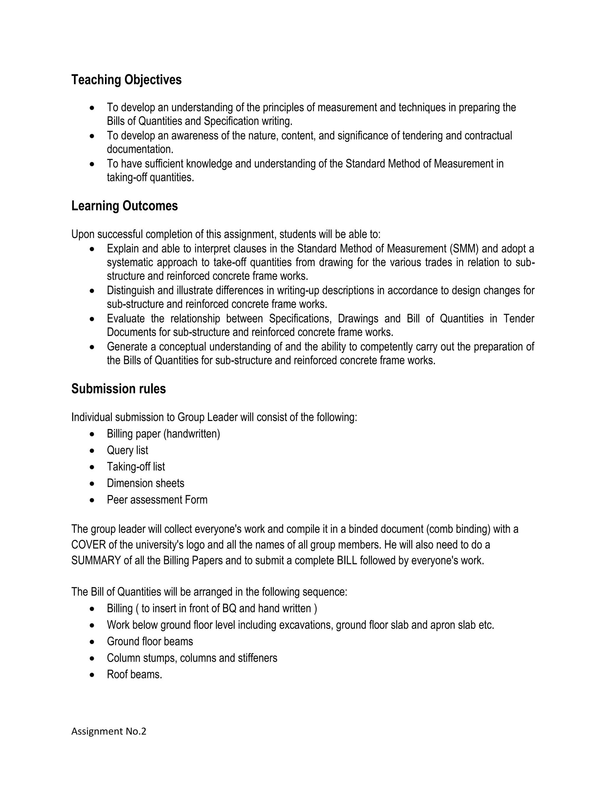 This document provides instructions for Assignment No. 2 which involves preparing a complete taking-off and bill of quantities for the structural elements of a proposed battalion quarters and police station building. Students are to measure the quantities of pad footings, excavations below ground floor, ground floor slab, beams, columns and stiffeners. The submission must include handwritten billing, a query list, taking-off list, dimension sheets, and peer assessment. The group leader will compile all components into a bound document and submit a summary bill of quantities arranged in the specified sequence. The assignment aims to develop skills in measurement techniques, interpreting standard methods, and generating tender documentation.