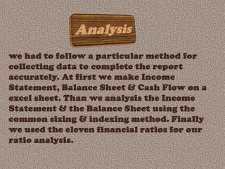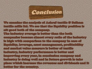 This document compares financial ratios for Ashraf Textile & Saiham Textile Mills Ltd over 2008-2009. It analyzes ratios such as debt/equity, account receivable turnover, inventory turnover, total asset turnover, gross profit margin, and net profit margin. Both companies are profitable but need to improve liquidity, asset management, and reduce costs to generate more profit. They should also pay down liabilities, increase equity, sell shares at high prices, and pay more dividends to investors.